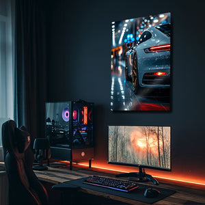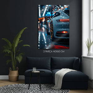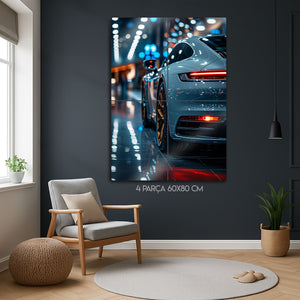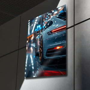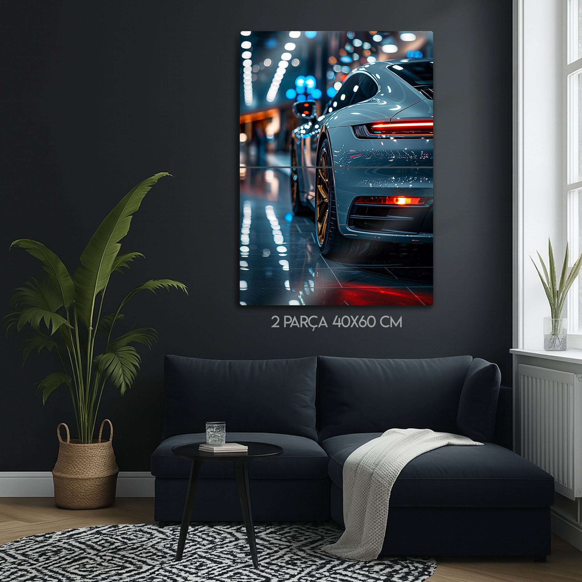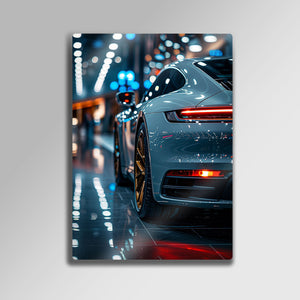 Otomotiv tasarımının ve mühendisliğinin zirvesini, lüks bir atmosferle duvarlarınıza taşıyın. Bu olağanüstü metal tablo, modern bir Porsche 911'in kusursuz hatlarını, parlak showroom ışıkları altında ve göz alıcı altın rengi jantlarıyla birlikte, adeta bir sanat galerisi objesi gibi sunuyor.
