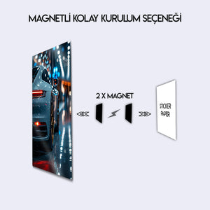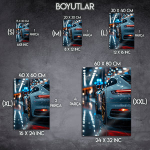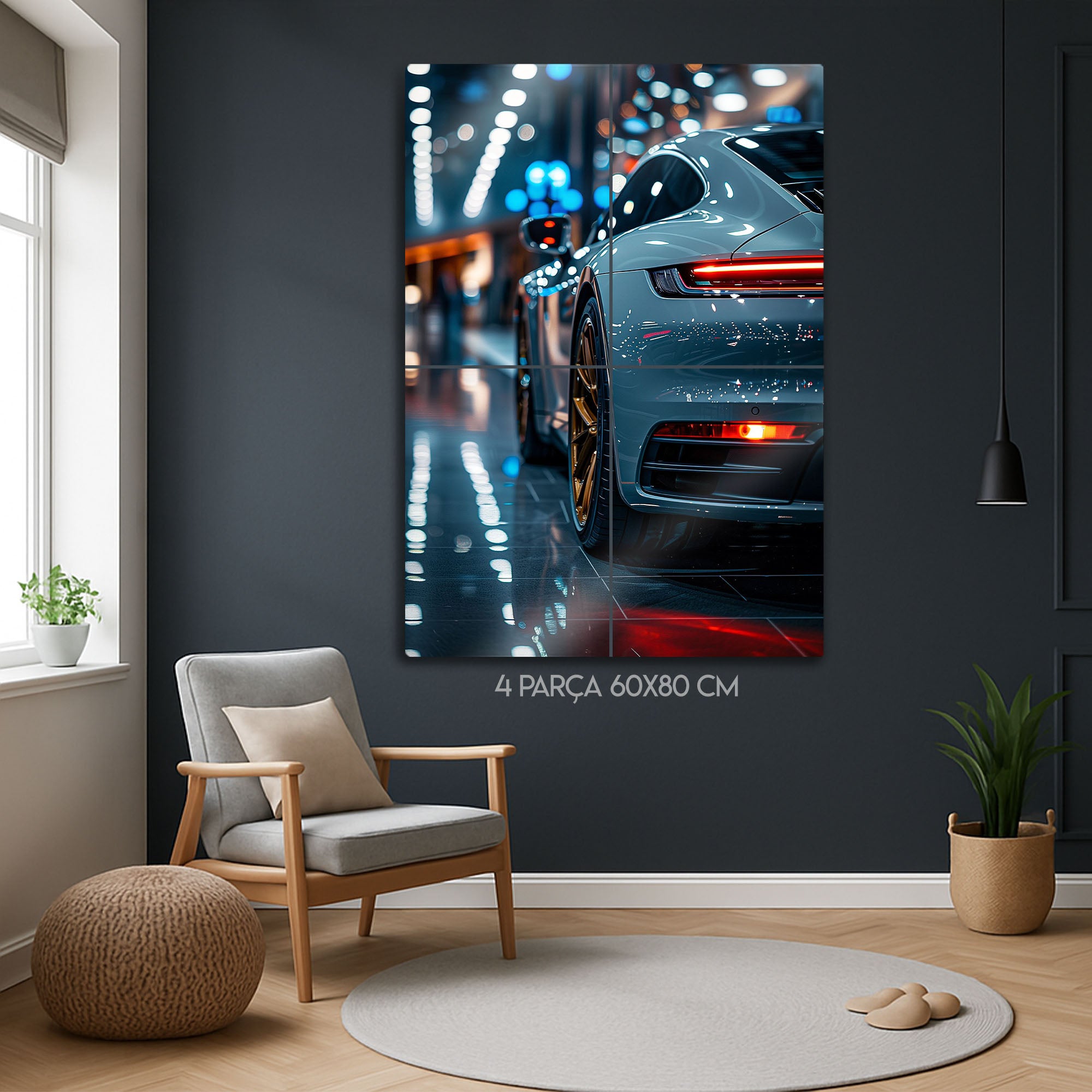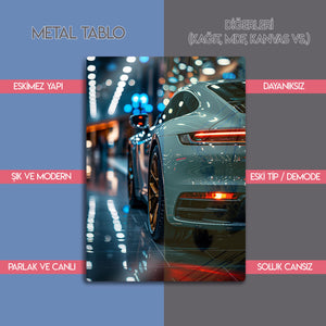 Bu eser, her otomobil ve lüks tutkununun hayallerini süsleyen, bir makineden çok daha fazlasını ifade eden bir "statement" parçasıdır. Metalin pürüzsüz ve parlak yüzeyi, otomobilin metalik gri boyasını, showroom ışıklarının yansımalarını ve her bir tasarım detayını mükemmel bir şekilde öne çıkarır. Garajınız, "man cave"iniz, ofisiniz veya modern salonunuz için tasarlanmış bu tablo, mekanınıza anında bir sofistike, lüks ve premium bir hava katacaktır.