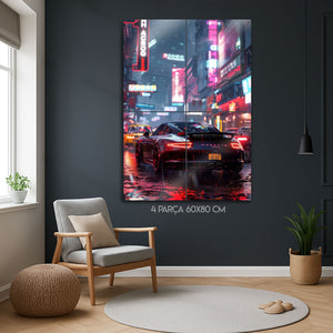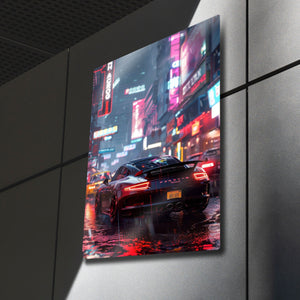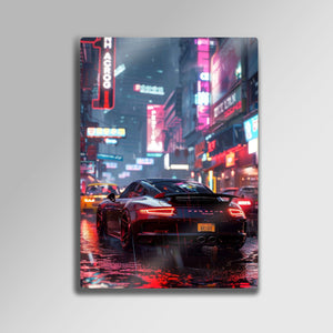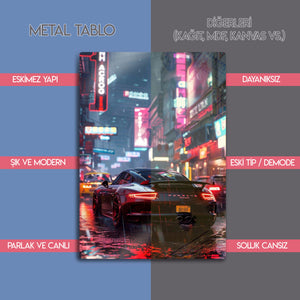 Otomotiv mükemmelliği, fütüristik bir metropolün neon ışıklarıyla buluşuyor. Bu olağanüstü metal tablo, efsanevi Porsche 911'i, yağmurun ıslattığı ve neon tabelaların aydınlattığı bir Tokyo sokağında, adeta bir siberpunk rüyasının içindeymiş gibi tasvir ediyor.