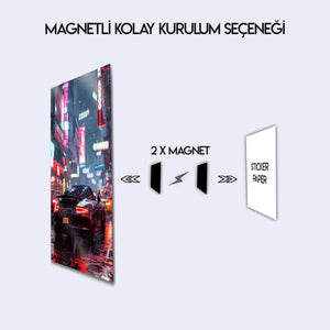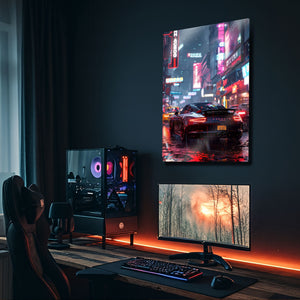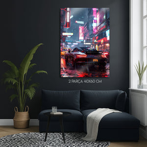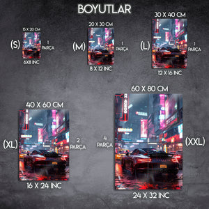 Bu eser, sadece bir araba posteri değil, aynı zamanda hızın, teknolojinin ve şehir yaşamının enerjisini yakalayan sinematik bir sanat eseridir. Yüksek çözünürlüklü baskı kalitesi, ıslak asfalttaki renkli yansımaları, aracın her bir kıvrımını ve o anın dinamik atmosferini metalin modern yüzeyinde adeta canlandırıyor. Oyun odaları, "man cave"ler, ofisler veya modern yaşam alanlarına anında bir karakter, hız ve fütüristik bir hava katacaktır.