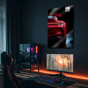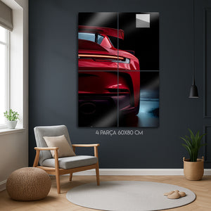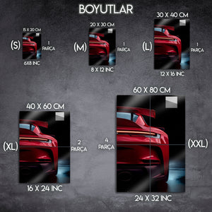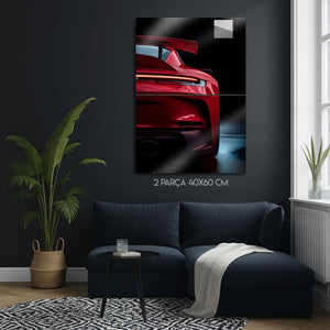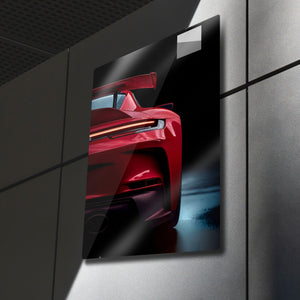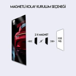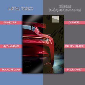 Bu eser, sadece bir araba fotoğrafı değil, aynı zamanda mühendisliğin, hızın ve saf sürüş zevkinin bir kutlamasıdır. Metalin modern ve pürüzsüz yüzeyi, aracın parlak boyasını ve dramatik aydınlatmayı mükemmel bir şekilde yansıtarak, tasarıma derinlik ve lüks bir hava katıyor. Garajınız, "man cave"iniz, ofisiniz veya modern salonunuz için mükemmel bir "statement" parçasıdır.