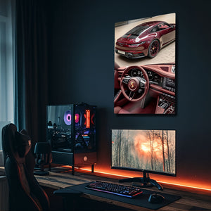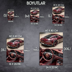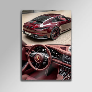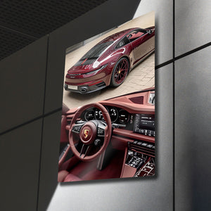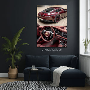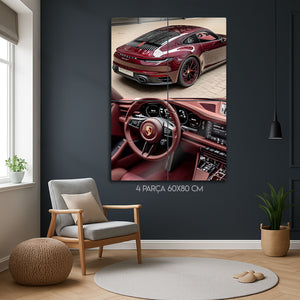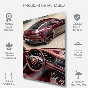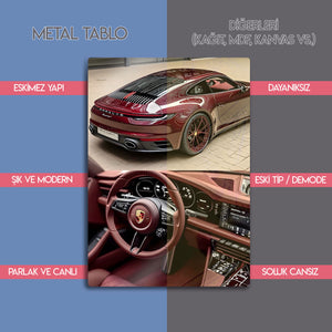 Otomotiv sanatının ve lüksün en ince detaylarını duvarlarınıza taşıyın. Bu olağanüstü metal tablo, efsanevi Porsche 911'in hem göz alıcı dış tasarımını hem de kusursuz işçiliğe sahip iç mekanını, sofistike bir kolajla bir araya getiriyor. Bordo (burgundy) rengin asil tonları, bu esere hem klasik hem de son derece modern bir hava katıyor.