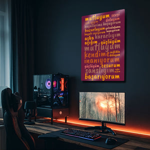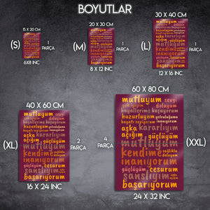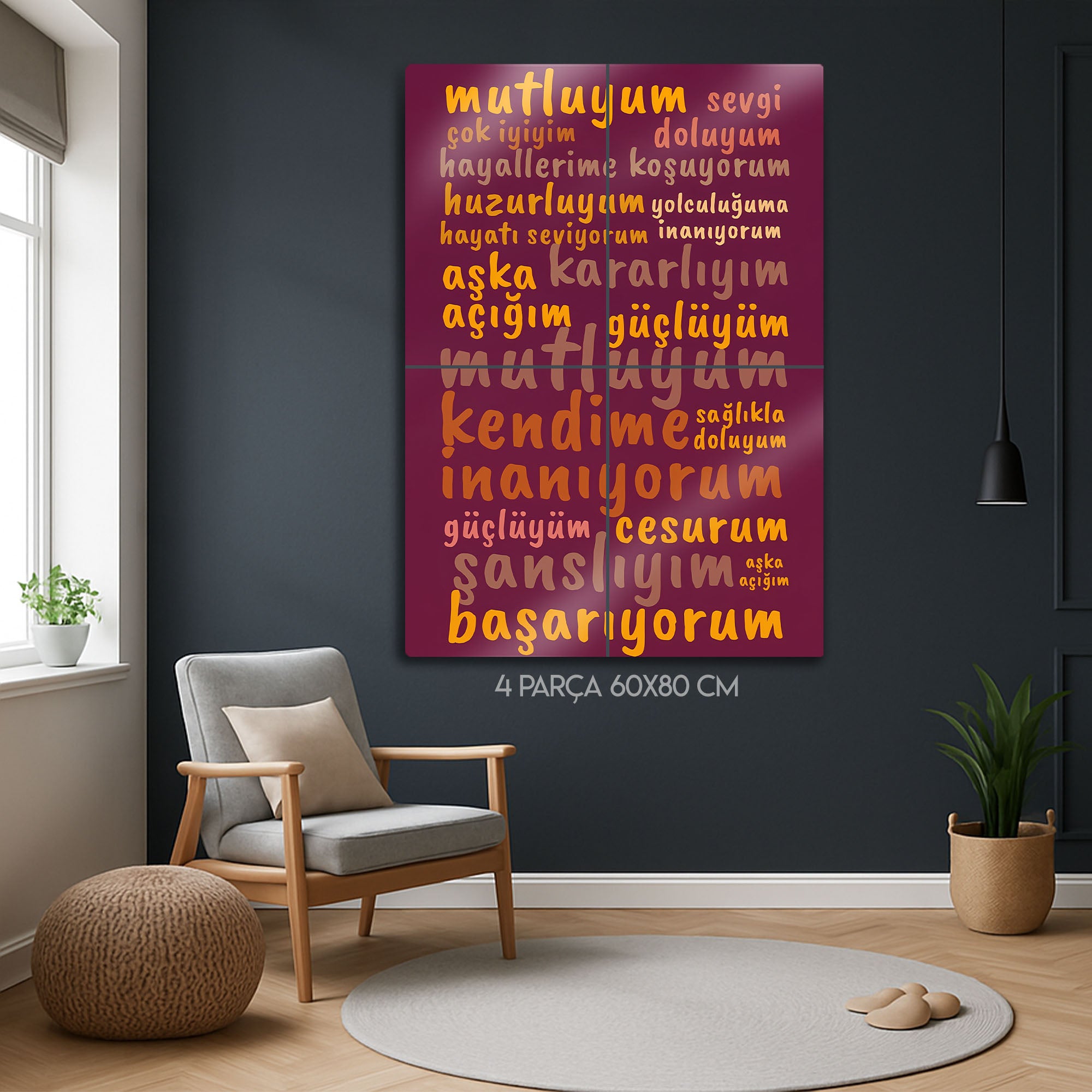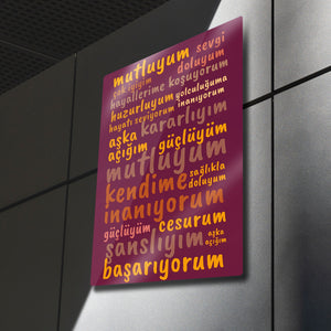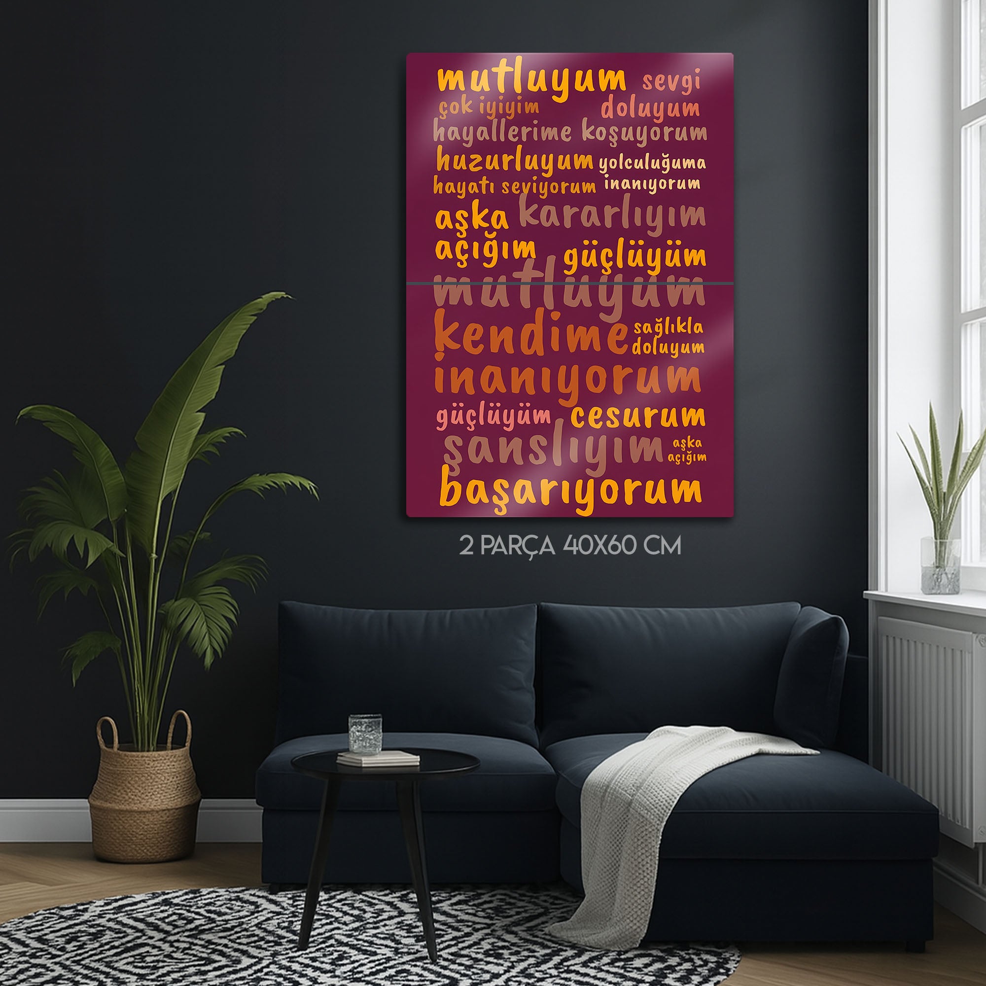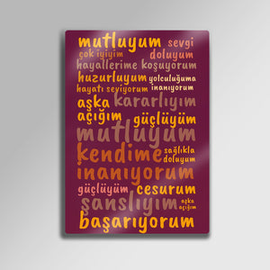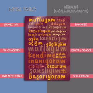 Güne pozitif bir başlangıç yapın ve duvarlarınıza ilham taşıyın! Bu enerjik metal tablo, "Mutluyum", "Güçlüyüm", "Kendime inanıyorum", "Hayallerime koşuyorum", "Başarıyorum" gibi hayatınıza neşe ve güç katacak pozitif olumlamaları, sıcak renkler ve dinamik bir tipografi sanatı ile bir araya getiriyor.