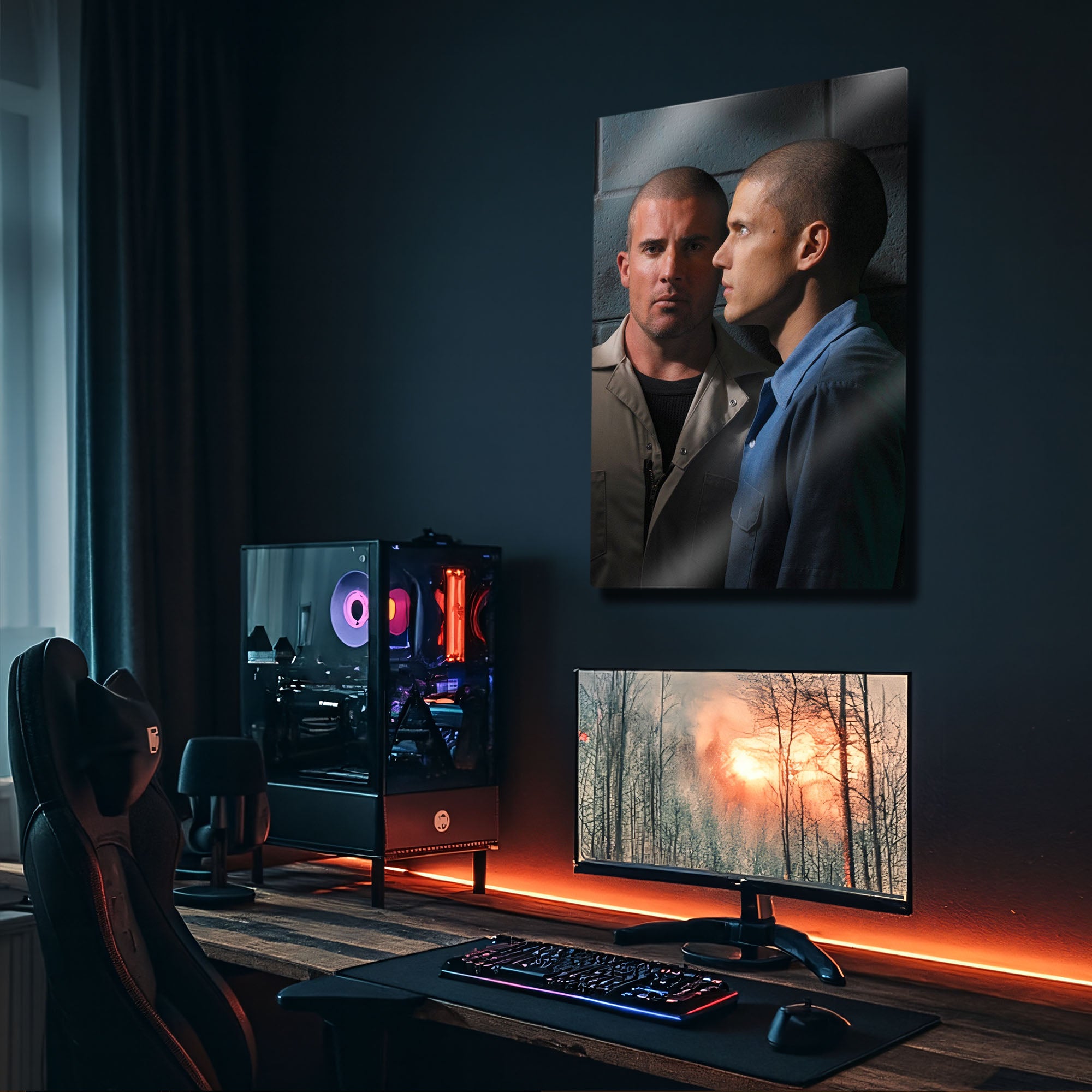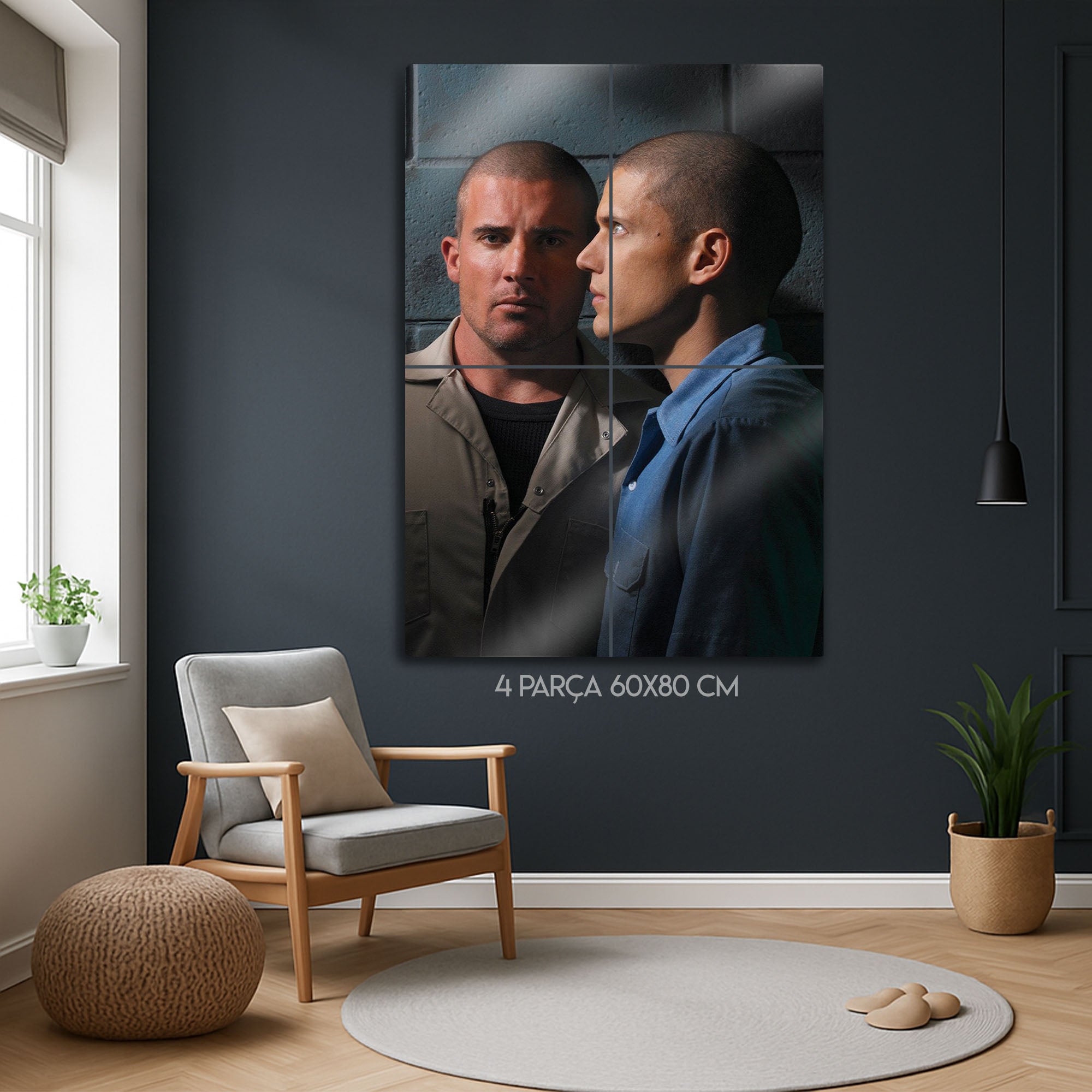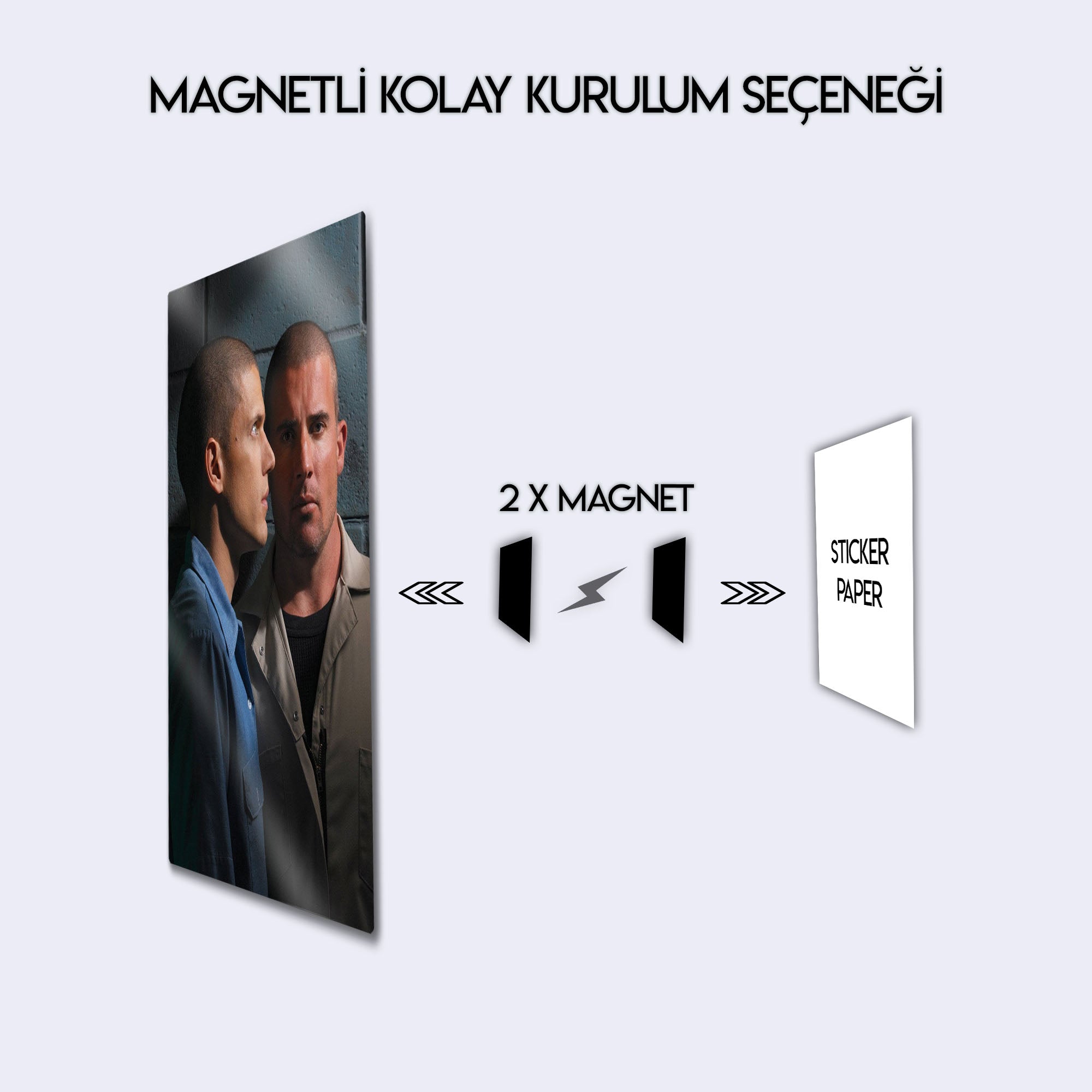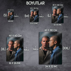 Kardeşlik bağının, zekanın ve sarsılmaz bir iradenin hikayesi... Televizyon tarihinin en unutulmaz kaçış planını duvarlarınıza taşıyın! Bu özel metal tablo, "Prison Break" dizisinin efsanevi kardeşleri Michael Scofield (Wentworth Miller) ve Lincoln Burrows'un (Dominic Purcell) o ikonik ve karizmatik duruşlarını, Fox River Eyalet Cezaevi'nin soğuk duvarları önünde yakalıyor.