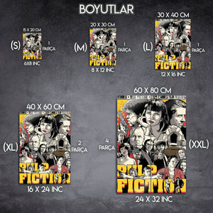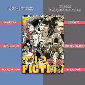 ''You know what they call a Quarter Pounder with Cheese in Paris?'' Sinema tarihinin en havalı, en stil sahibi ve en unutulmaz karakterlerini duvarlarınızda bir araya getirin! Bu olağanüstü metal tablo, Quentin Tarantino'nun başyapıtı "Pulp Fiction"ın (Ucuz Roman) tüm efsanevi karakterlerini (Vincent Vega, Jules Winnfield, Mia Wallace, Butch Coolidge ve daha fazlası), dinamik bir çizgi roman ve pop art estetiğiyle sunuyor.