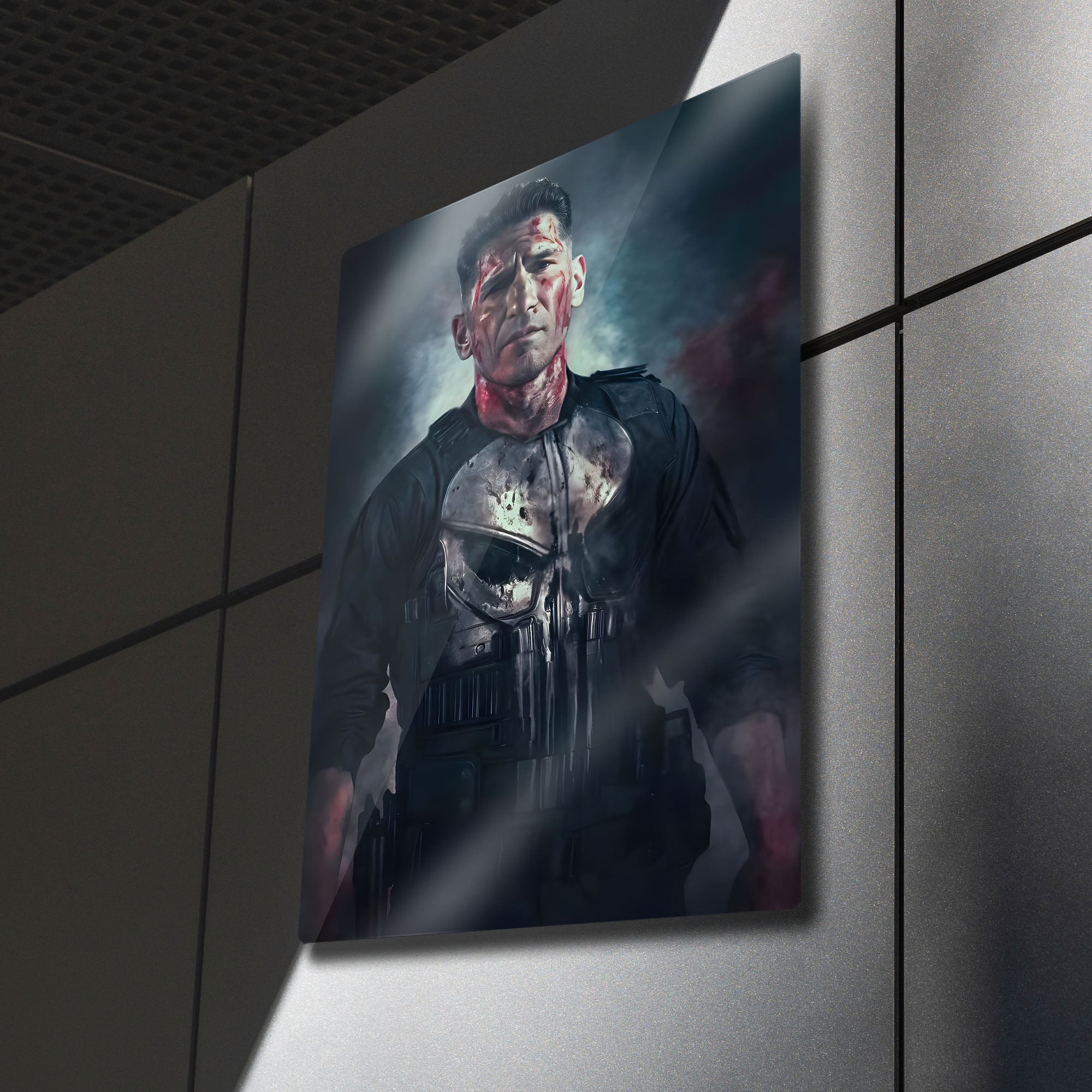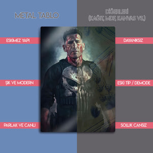 ''One batch, two batch... Penny and dime.'' Adaleti kendi elleriyle sağlayan, Marvel evreninin en unutulmaz anti-kahramanı Frank Castle'ın o acı dolu ve kararlı duruşunu duvarlarınıza taşıyın. Bu olağanüstü metal tablo, Jon Bernthal'ın efsanevi performansıyla hayat bulan The Punisher'ı, sayısız savaştan çıkmış, kanlar içinde ama asla pes etmemiş haliyle ölümsüzleştiriyor.