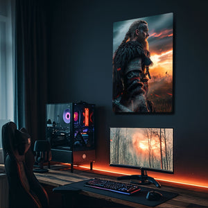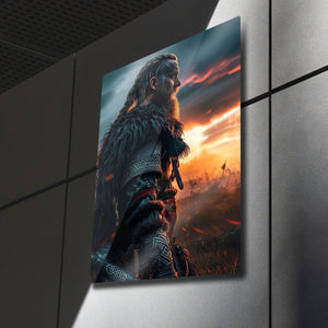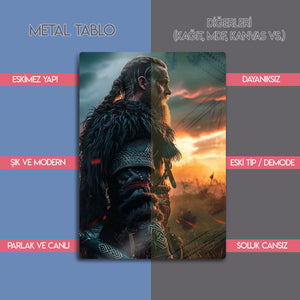 Kırmızı ve mavinin çarpıcı kontrastı, savaşın ateşini ve kuzeyin soğuk ruhunu bir araya getirerek, bu esere hem vahşi hem de son derece epik bir atmosfer katıyor. Bu tablo, sadece bir tarihi figür portresi değil, aynı zamanda onurun, gücün ve asla pes etmeyen bir savaşçı ruhunun manifestosudur. Metalin modern dokusu, bu dinamik ve sanatsal tasarımın her bir detayını ve enerjisini daha da öne çıkarır.