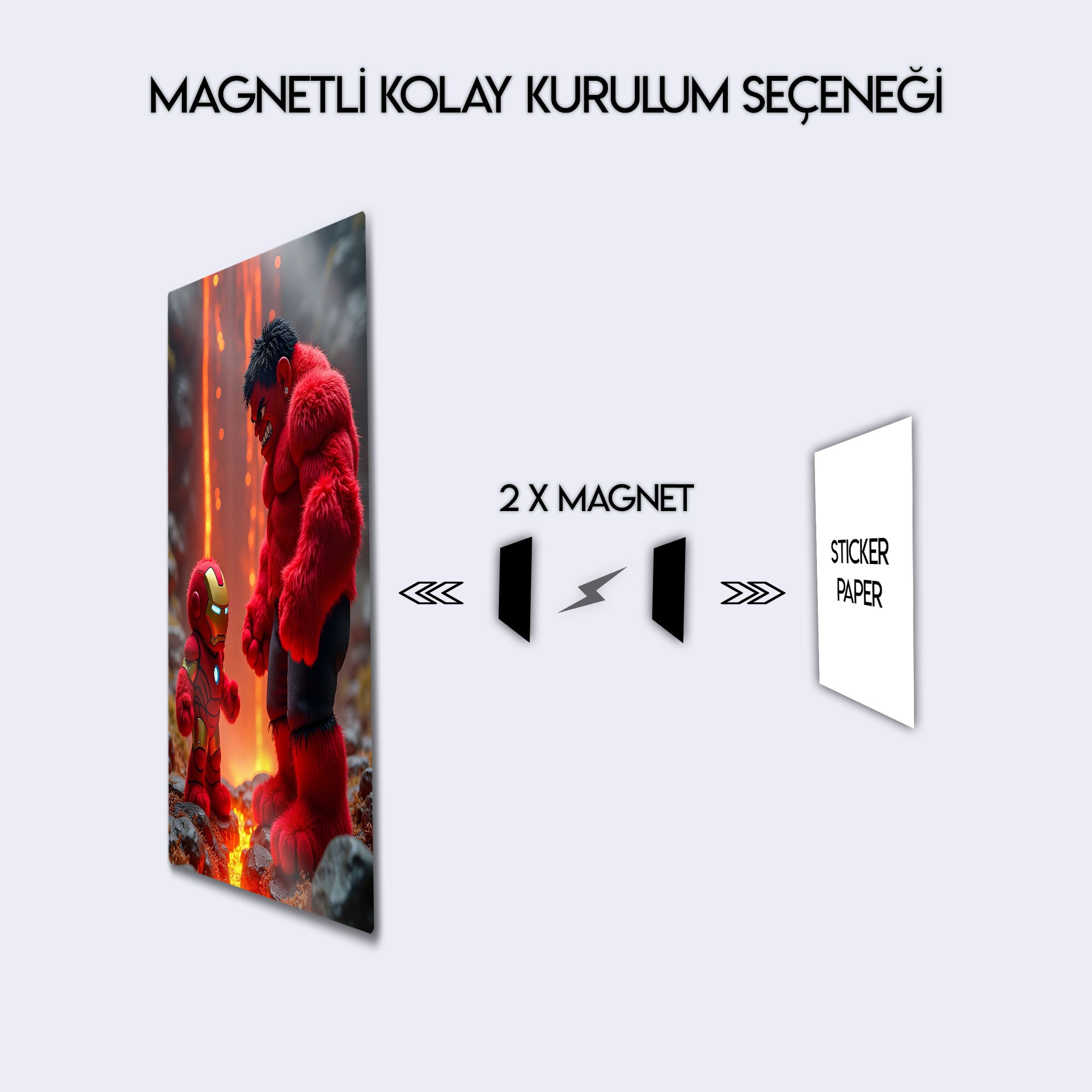 Marvel evreninin iki devi, öfkeli Red Hulk ve teknoloji harikası Iron Man, bu epik metal tabloda karşı karşıya. Volkanik bir arenada geçen bu eşsiz anı, karakterlerin özel peluş tasarımlarıyla duvarınıza taşıyın. Yüksek kaliteli metal baskısı ve canlı renkleriyle odanıza bambaşka bir hava katacak bu eser, süper kahraman hayranları için mükemmel bir hediye seçeneğidir.