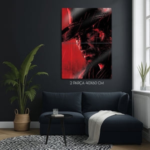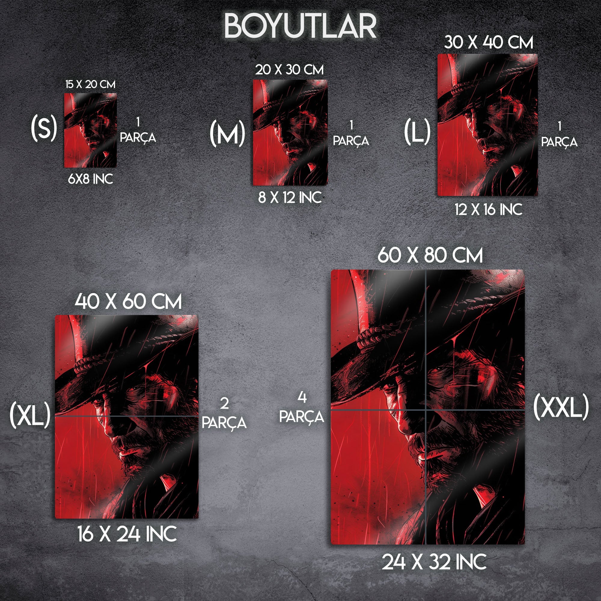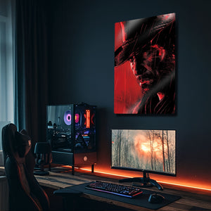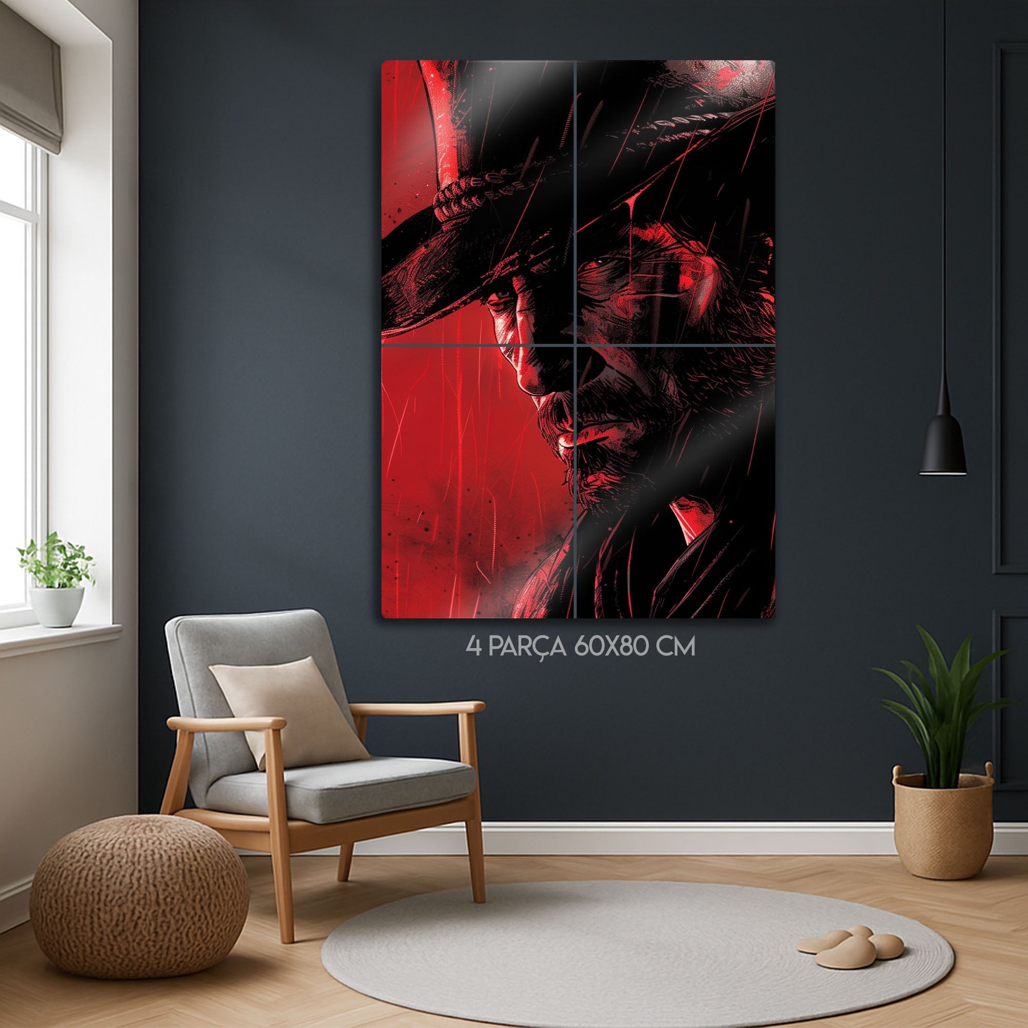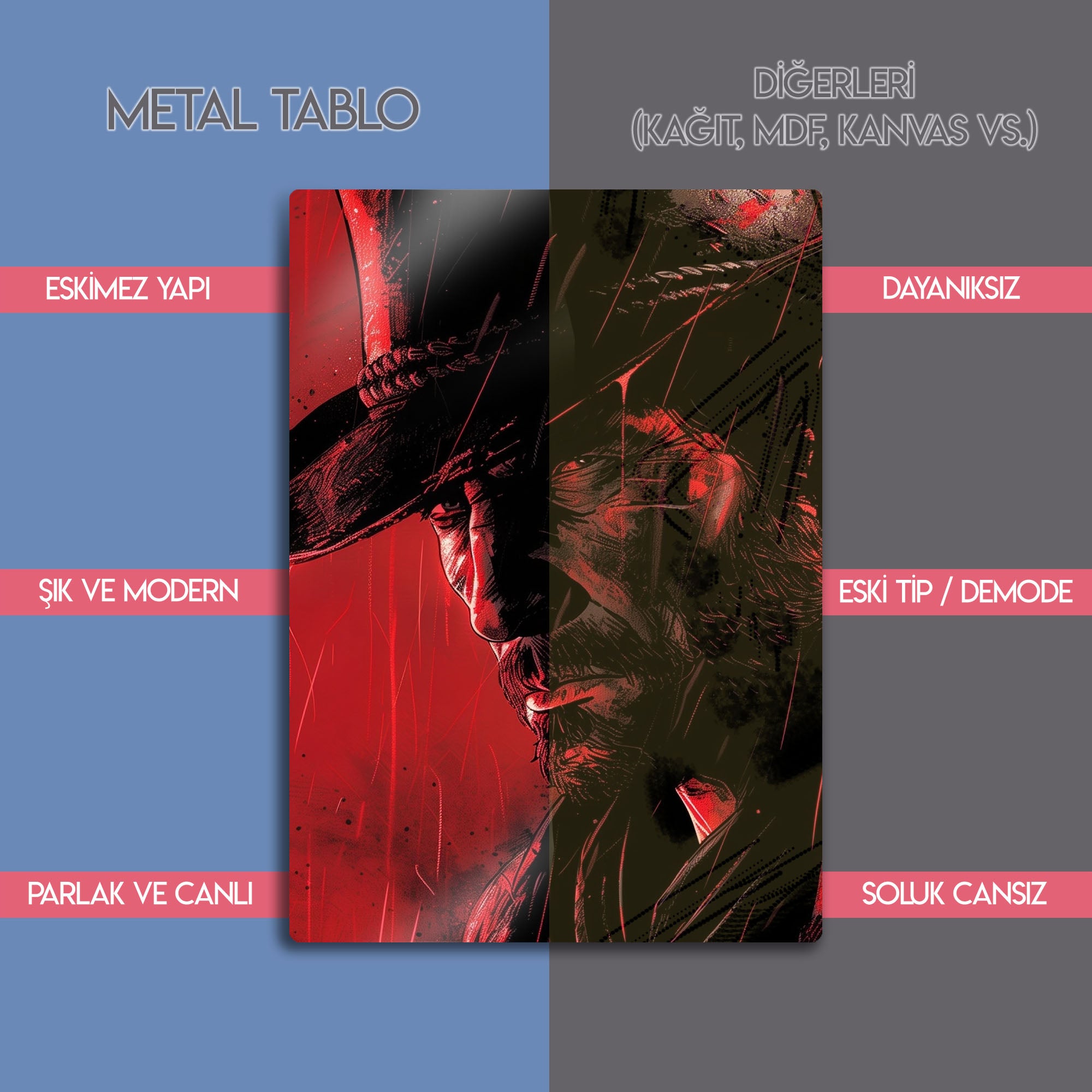 Vahşi Batı'nın son kanun kaçağının o yorgun ama sarsılmaz ruhunu, sanatsal bir yorumla duvarlarınıza taşıyın. Bu olağanüstü metal tablo, Red Dead Redemption 2'nin efsanevi kahramanı Arthur Morgan'ı, "Sin City" estetiğini andıran, yüksek kontrastlı kırmızı ve siyah tonlarda, karanlık ve dramatik bir portreyle sunuyor.