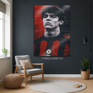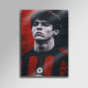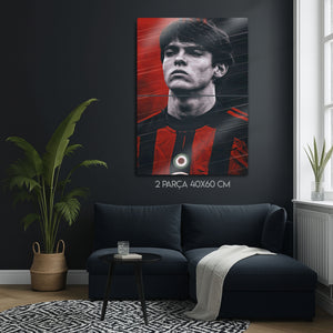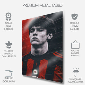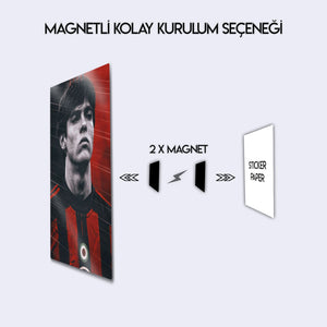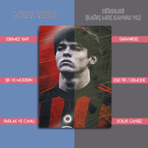 Siyah beyaz portrenin üzerindeki canlı kırmızı forma detayları, tabloya dramatik bir derinlik ve güç katarken, metalin modern dokusuyla birleşerek eşsiz bir sanat eseri ortaya çıkarıyor. Futbolseverler, AC Milan taraftarları ve spor tarihinin en stil sahibi oyuncularından birine hayranlık duyan herkes için mükemmel bir dekorasyon parçasıdır. Oyun odası, salon, ofis veya genç odası gibi mekanlara anında sportif bir şıklık ve tutku katacaktır.