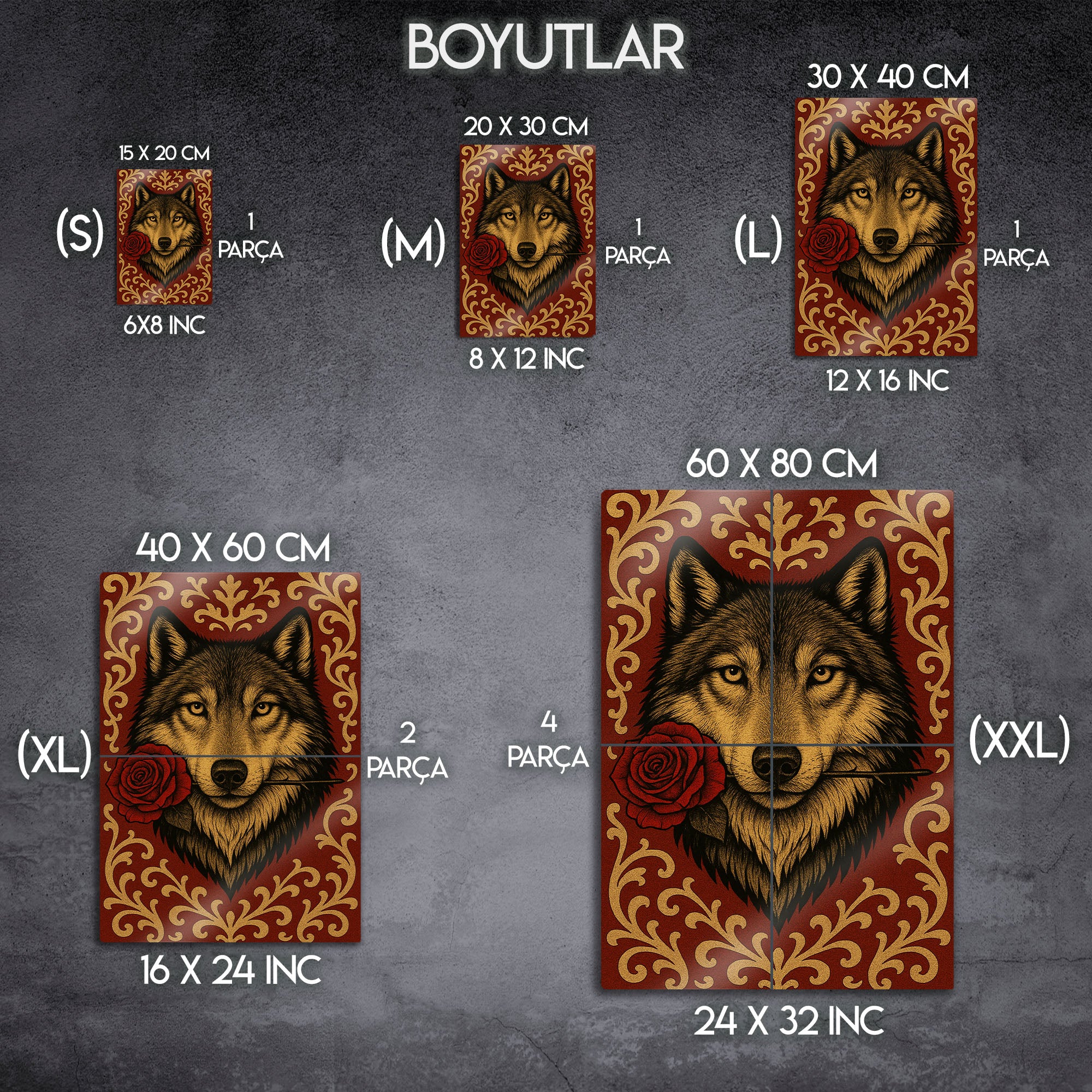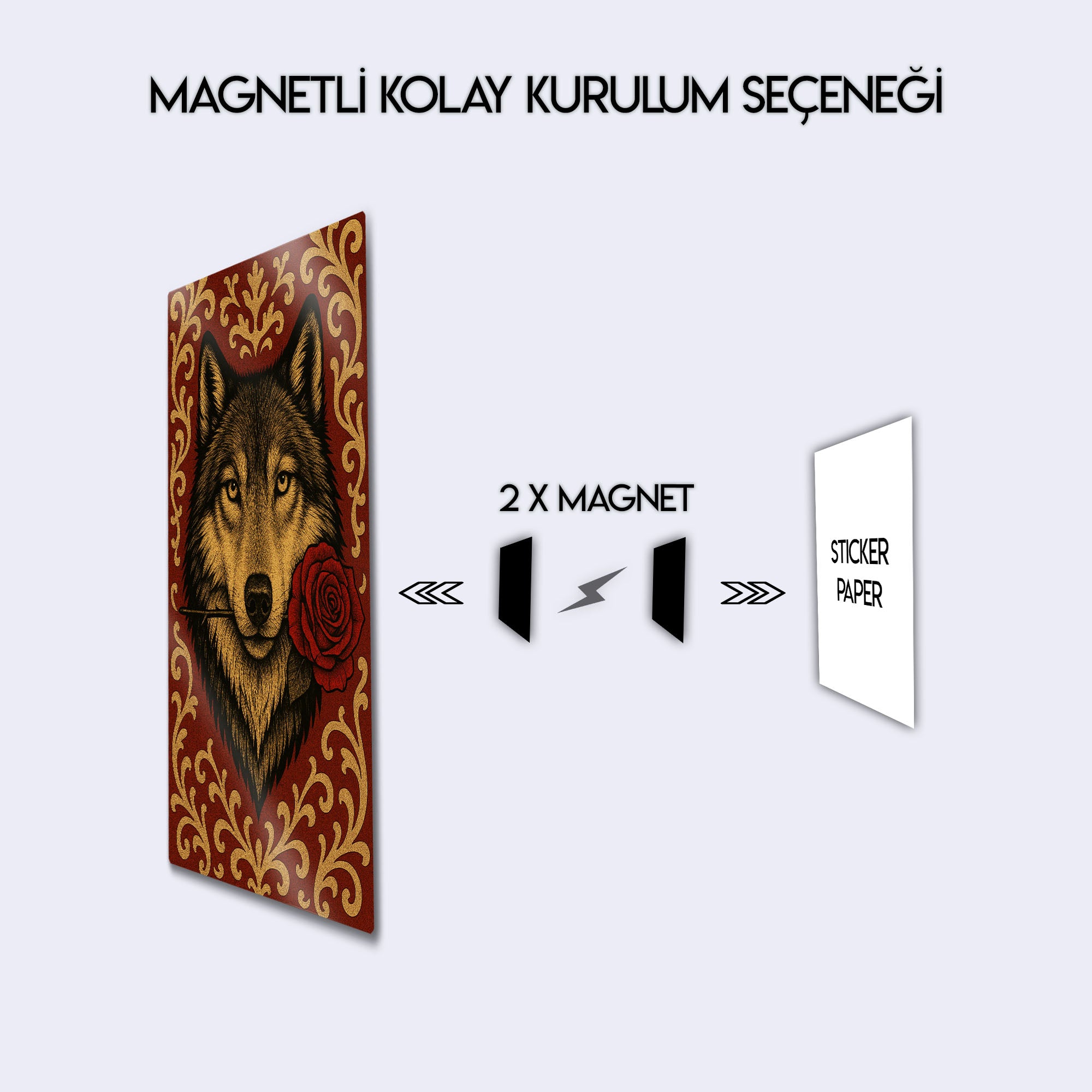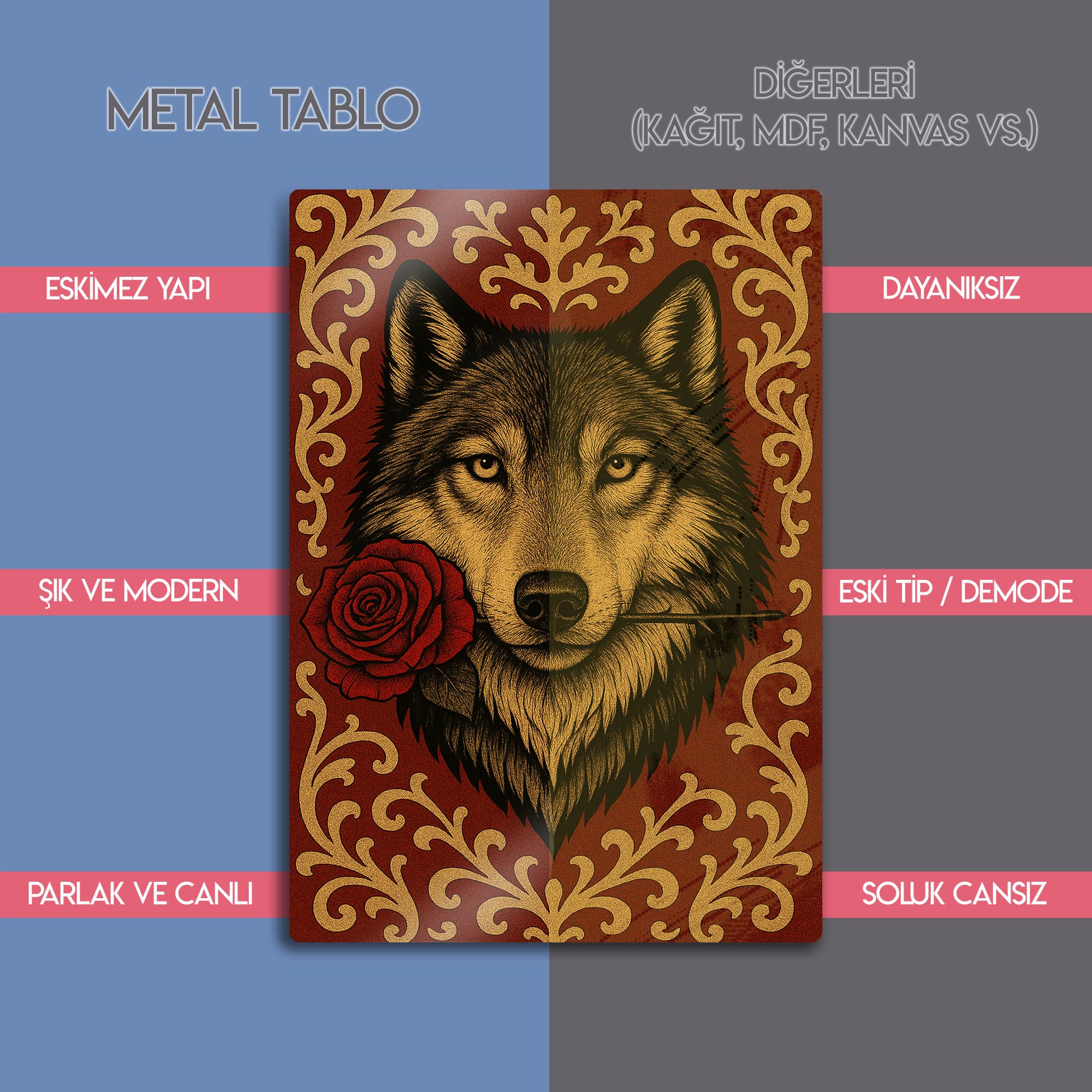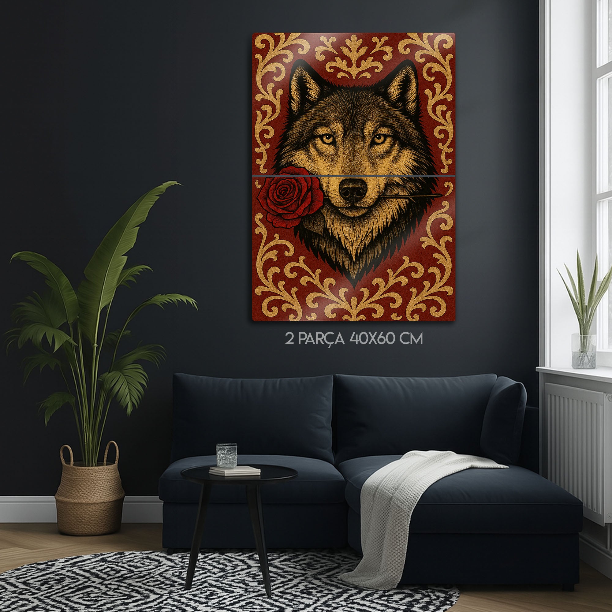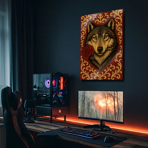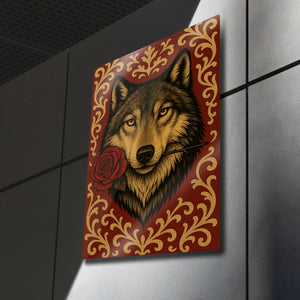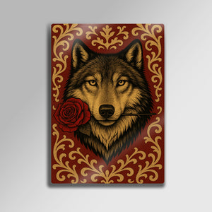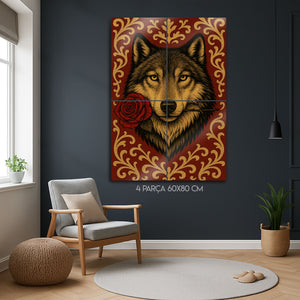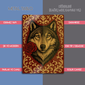 Vahşi ruhun ve romantik jestin beklenmedik buluşması... Bu olağanüstü metal tablo, ağzında tuttuğu tek bir kırmızı gülle bakan bir kurdun asil ve duygusal portresini sunuyor. Lüks kırmızı bir zemin üzerine işlenmiş altın rengi barok ve rokoko tarzı desenler, bu esere klasik bir zarafet ve zenginlik katıyor.