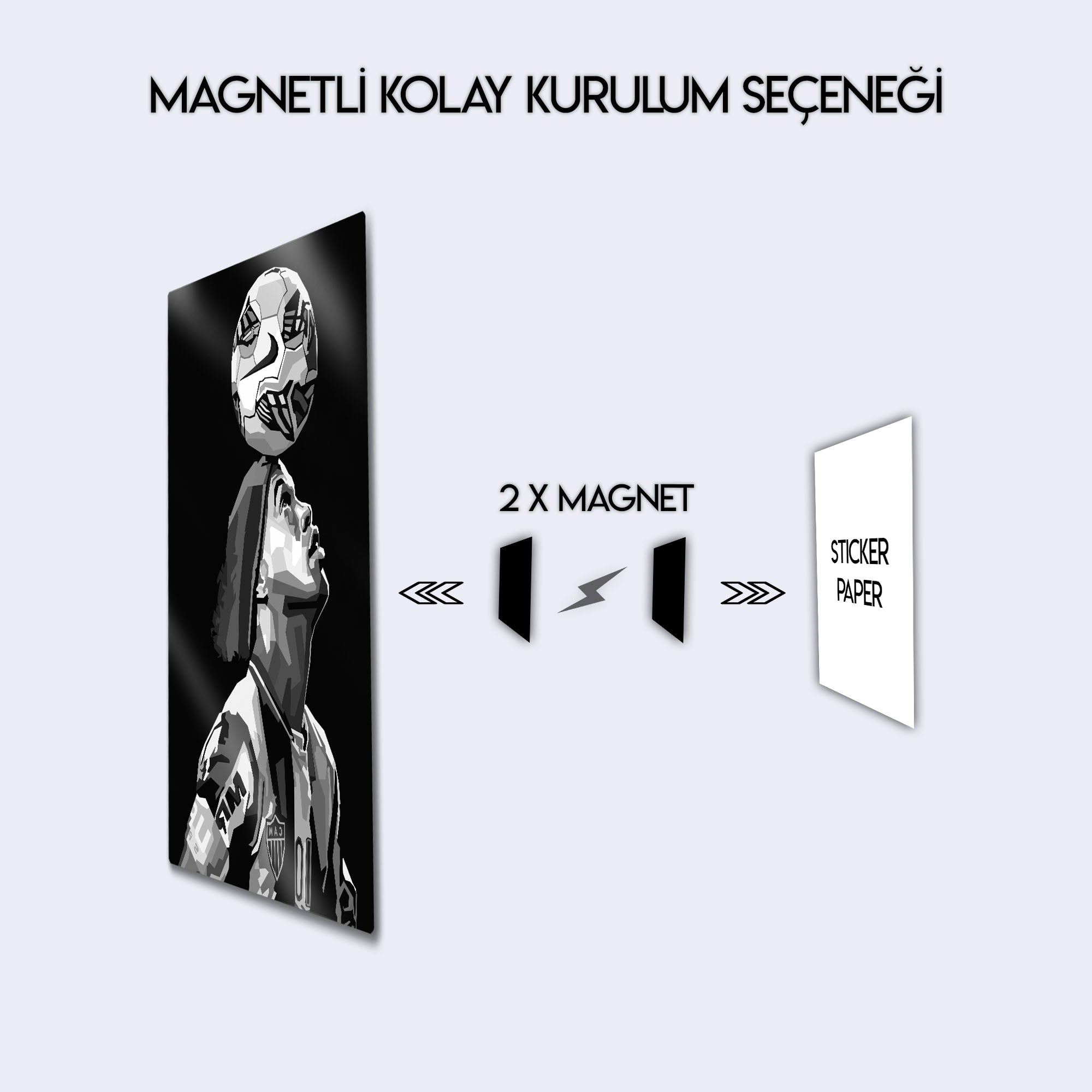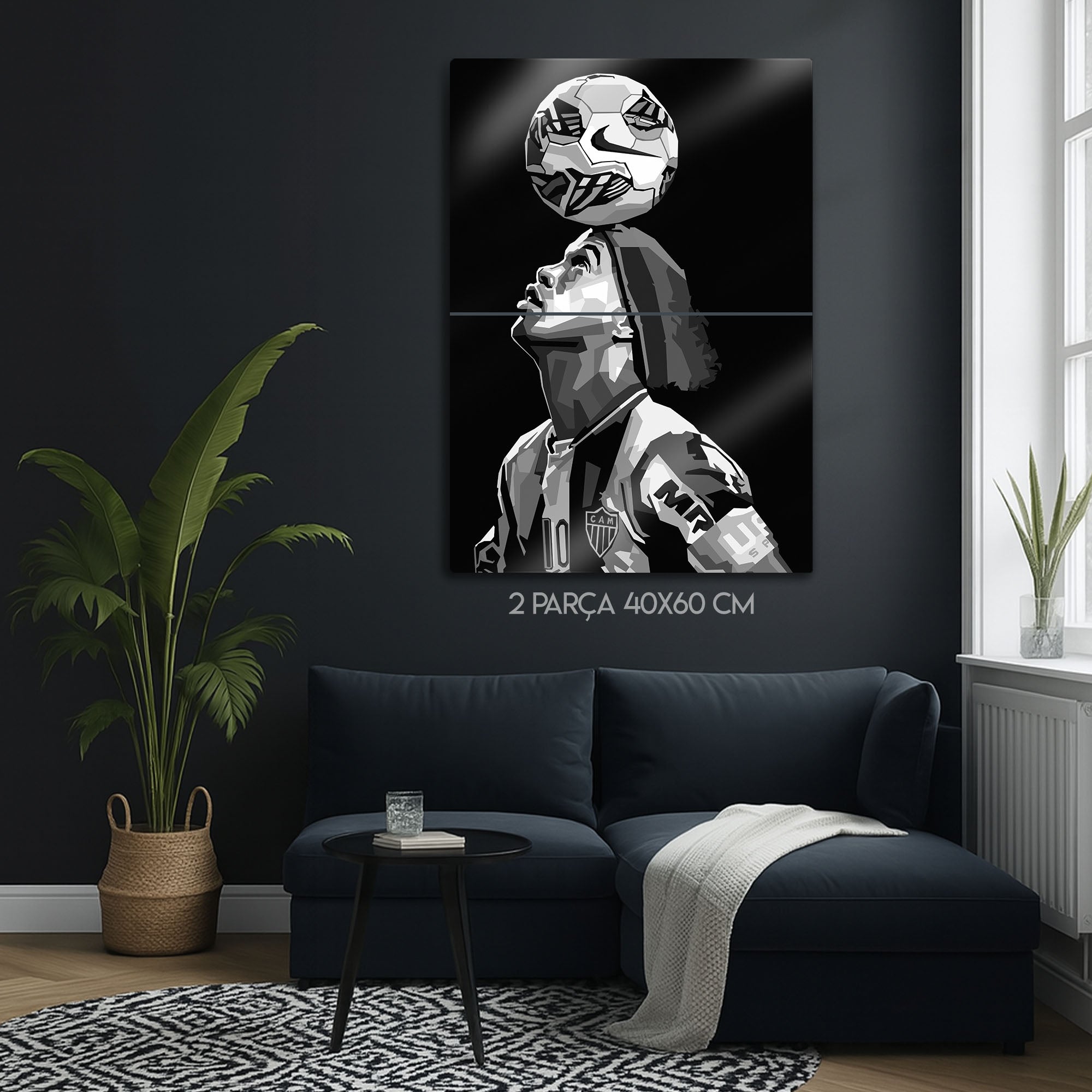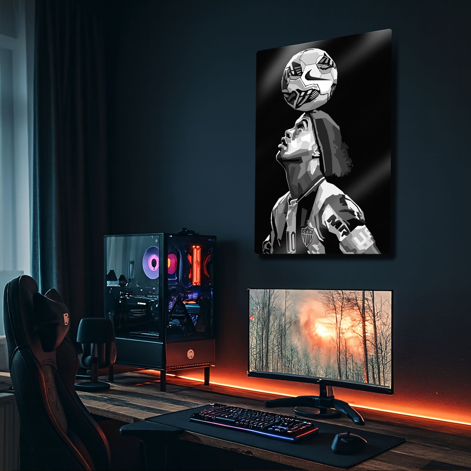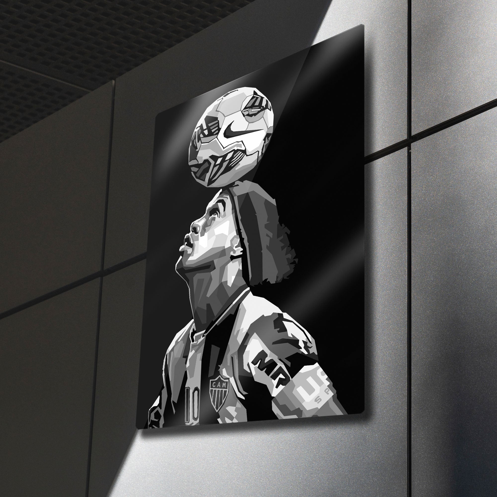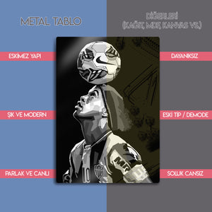 Bu eser, sadece bir spor posteri değil, aynı zamanda futbolun neşesinin, estetiğinin ve saf yeteneğin bir kutlamasıdır. Metalin modern ve tok duruşu, bu zamansız tasarımın her bir geometrik şeklini ve gölgesini mükemmel bir şekilde öne çıkarır. Spor odaları, "man cave"ler, genç odaları veya modern yaşam alanlarına anında bir stil, karizma ve futbol sanatı ruhu katacaktır.