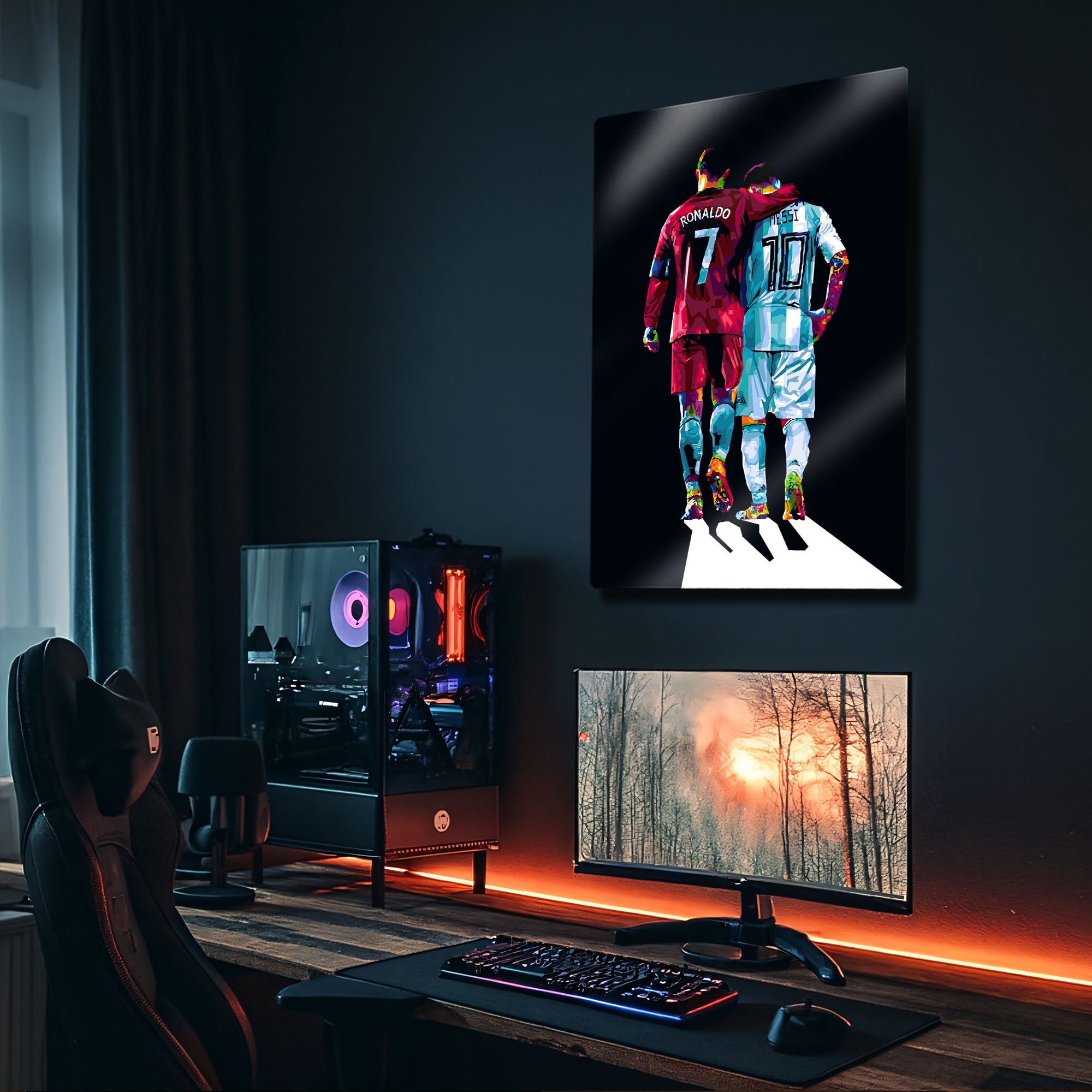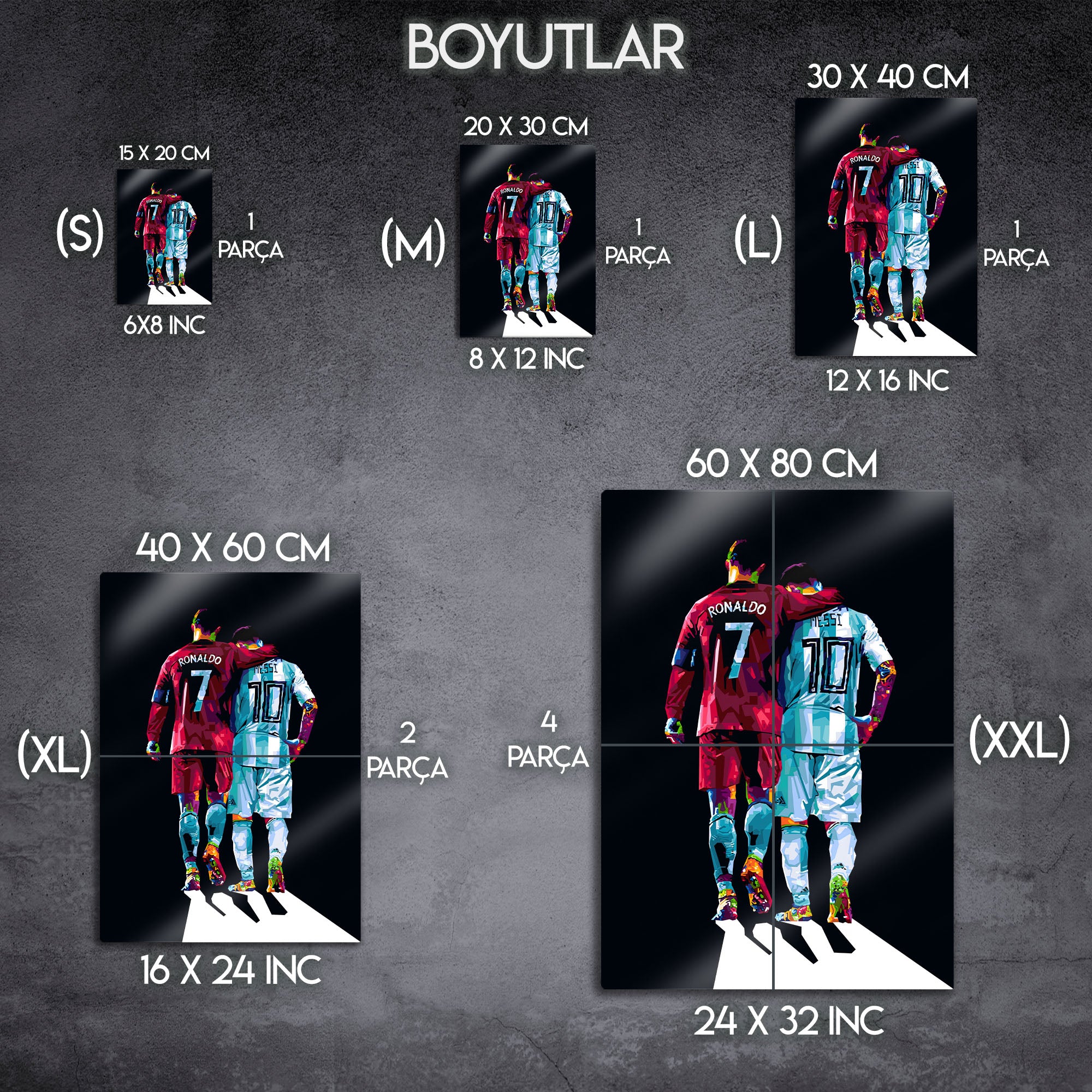Futbol tarihinin en büyük rekabeti, iki ölümsüz efsane, Cristiano Ronaldo ve Lionel Messi, bu epik sanat eserinde bir araya geliyor. Bu olağanüstü metal tablo, iki G.O.A.T.'ın (Tüm Zamanların En İyisi) birbirlerine duydukları saygıyı ve futbol sahnesinden ayrılışlarını simgeleyen o unutulmaz anı, canlı ve dinamik bir pop art (WPAP) stiliyle ölümsüzleştiriyor.