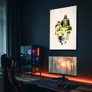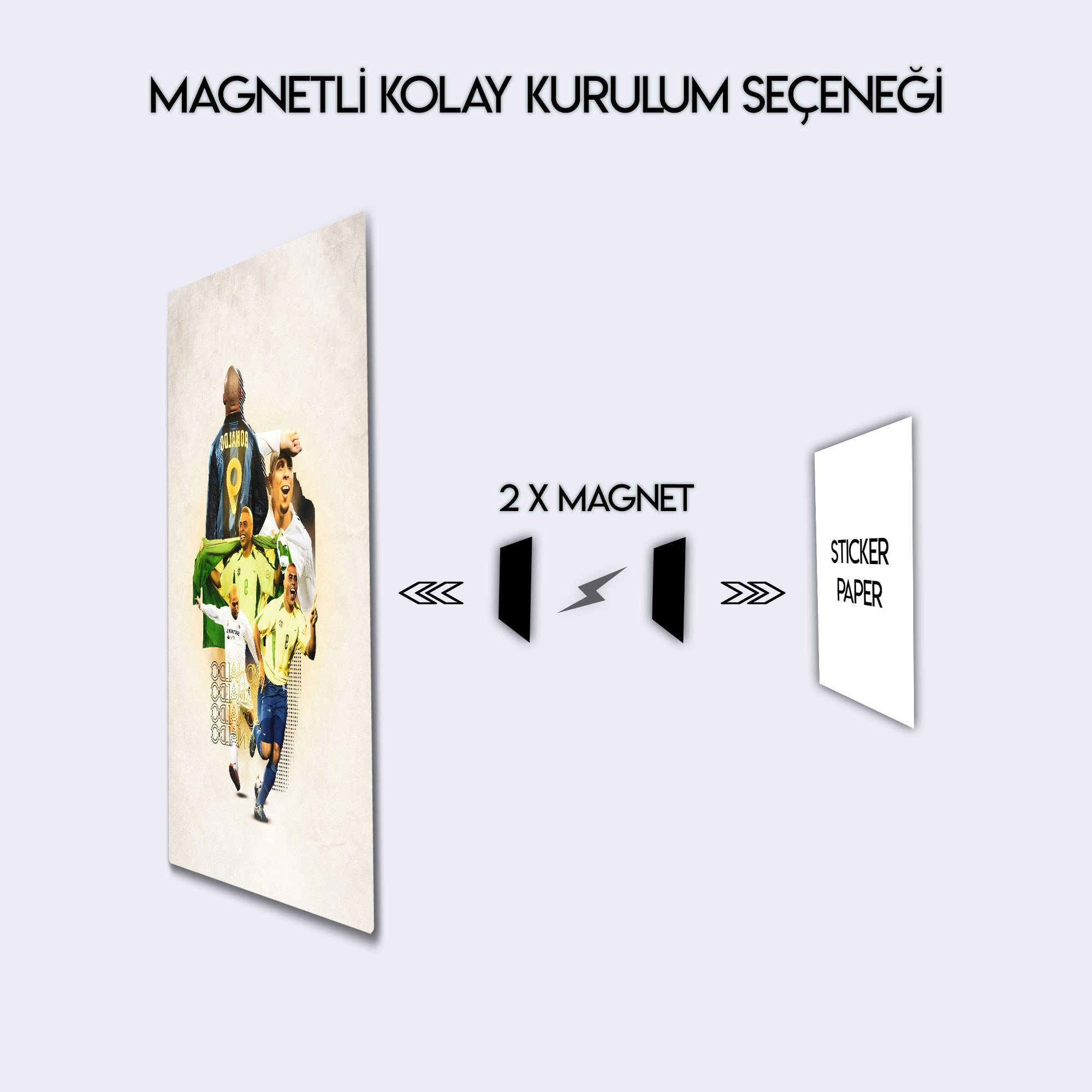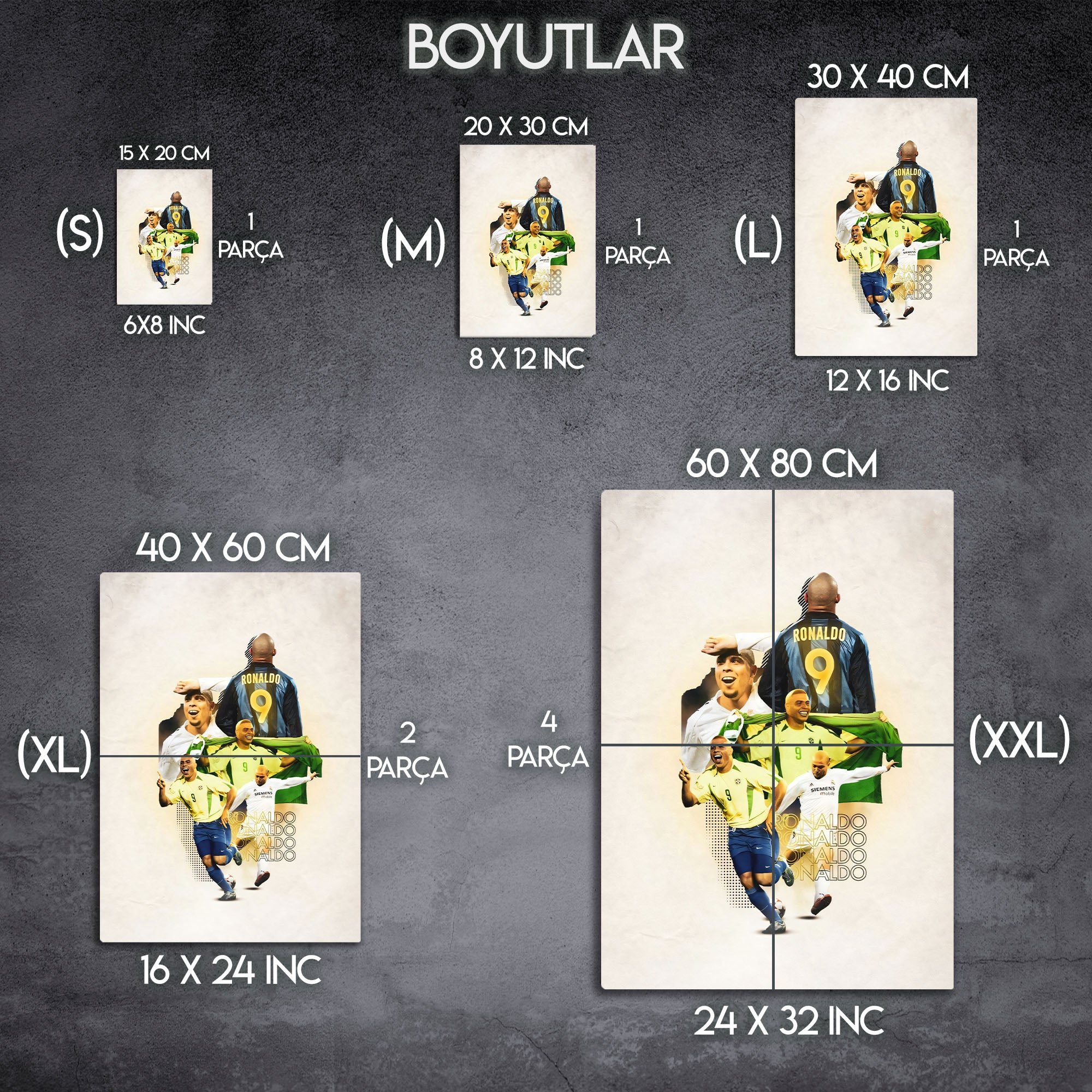 'El Fenomeno'' Futbol tarihinin gördüğü en saf yetenek, en durdurulamaz golcü, efsanevi Ronaldo Nazário'nun o unutulmaz kariyerini duvarlarınızda ölümsüzleştirin. Bu özel tasarım metal tablo, Ronaldo'nun Brezilya Milli Takımı, Real Madrid ve Inter gibi takımlarla yaşadığı zaferleri ve ikonik anlarını, modern ve sanatsal bir kolajla bir araya getiriyor.