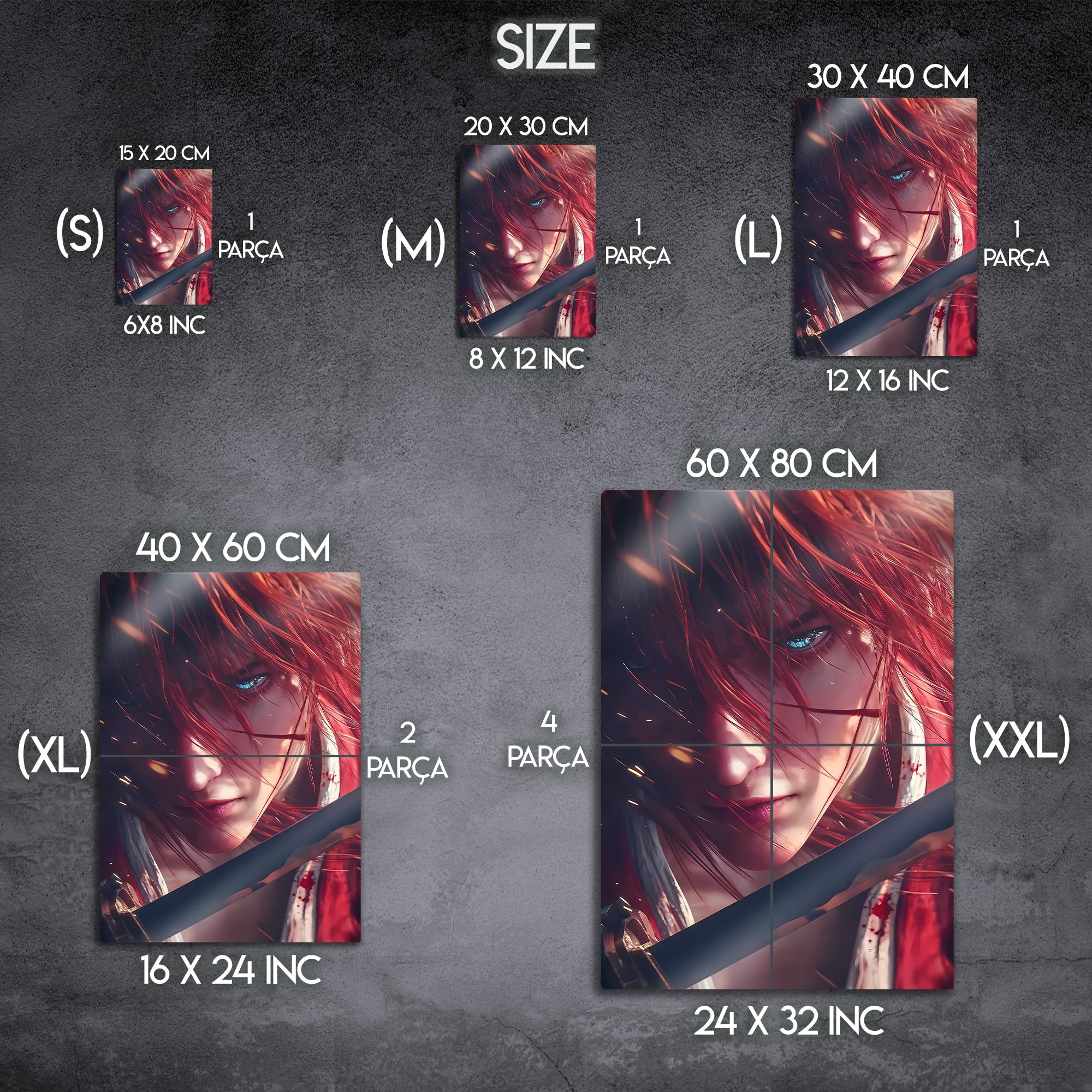 S (15x20), M (20x30), L (30x40), XL (40x60) / 2 Parça, XXL (60x80) / 4 Parça |