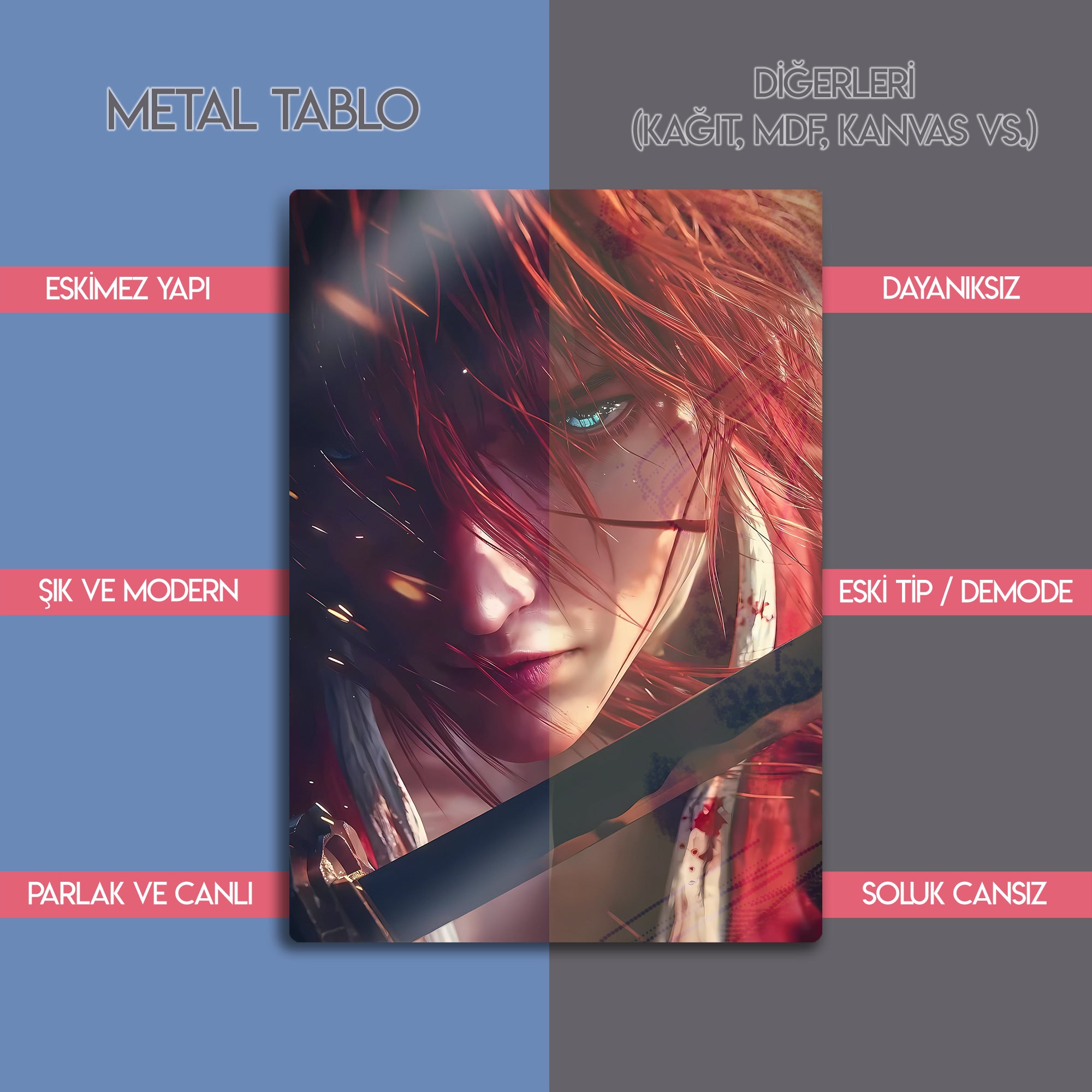 Rurouni Kenshin Meiji Kenkaku Roman Tan veya Samurai X anime metal tablosu şimdi sizlerle. Evinize, ofisinize, duvarınıza renk katacak eşsiz koleksiyonda bir dekoratif tablo. Farklı tarzda seçilebilir boyutlar ile sipariş verebilirsiniz.