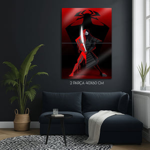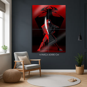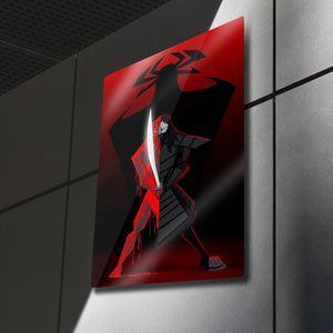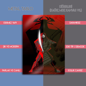 ''Gotta get back, back to the past, Samurai Jack!'' Animasyon dünyasının en sanatsal ve en epik kahramanlarından Samurai Jack'in o unutulmaz mücadelesini duvarlarınıza taşıyın. Bu olağanüstü metal tablo, Jack'in, ezeli düşmanı Aku'nun gölgesinde, adalet arayışındaki o kararlı ve kanlı anını, minimalist ve güçlü bir vektörel sanatla tasvir ediyor.