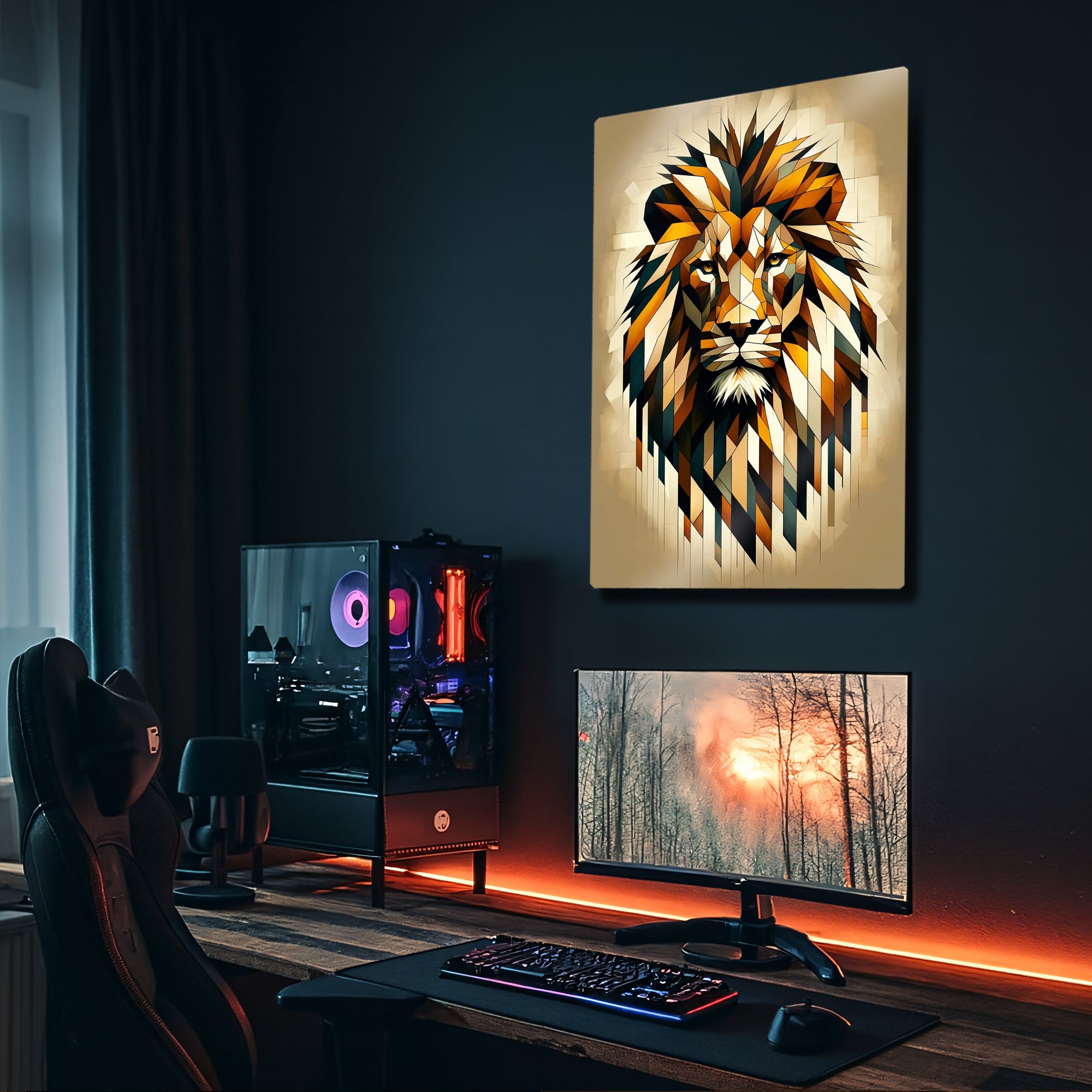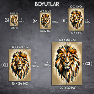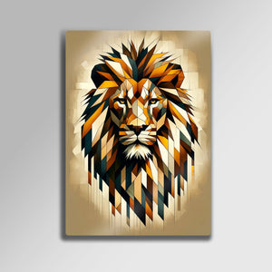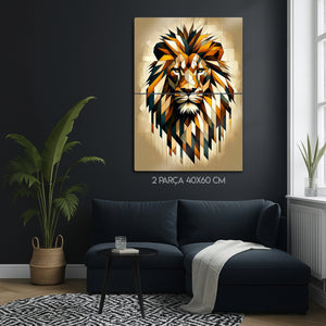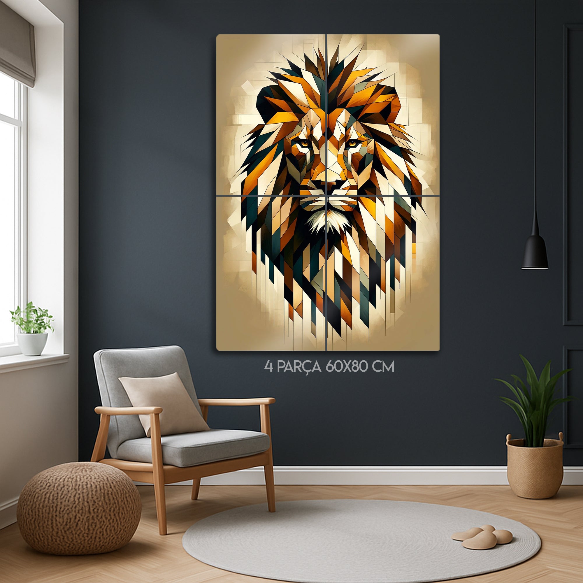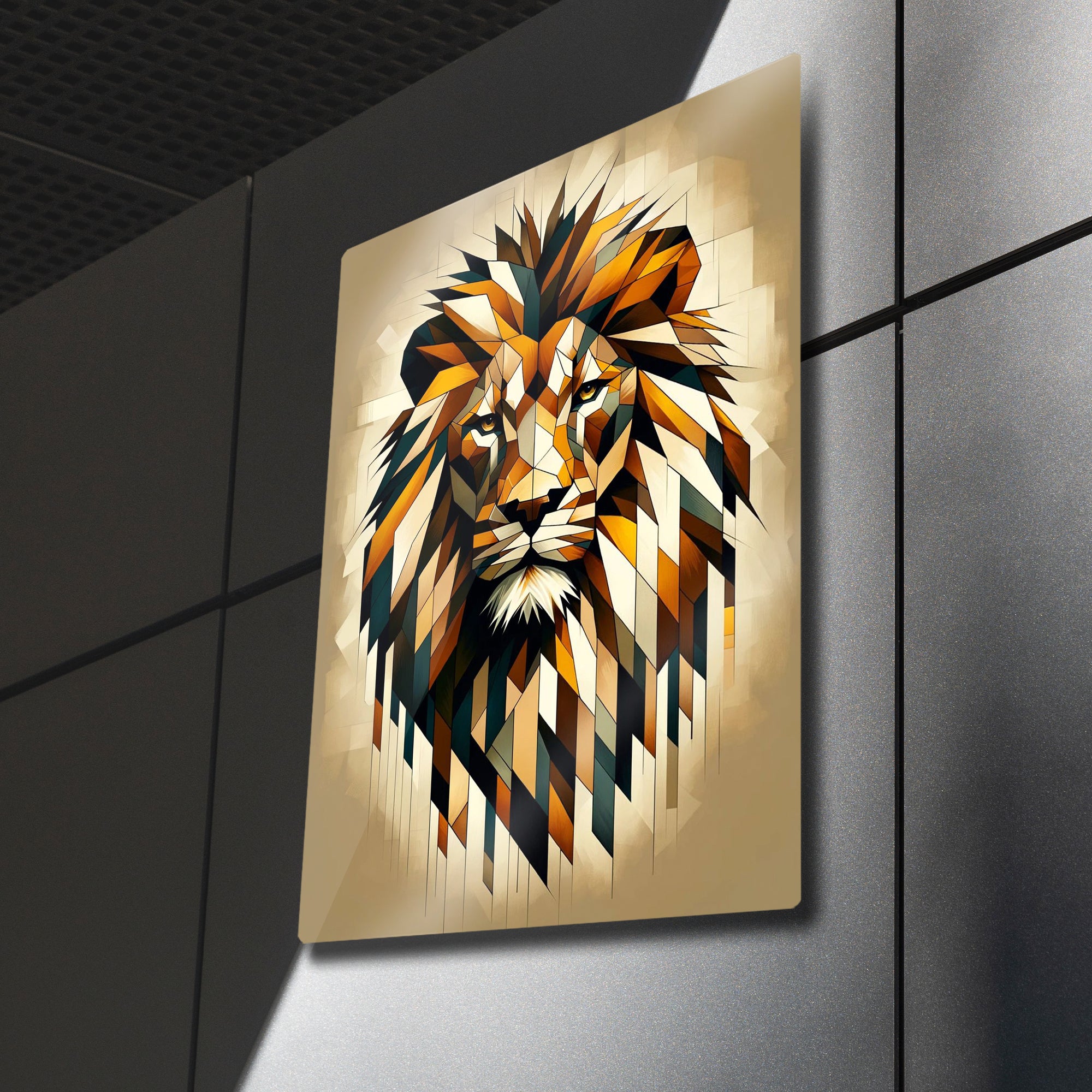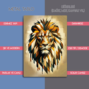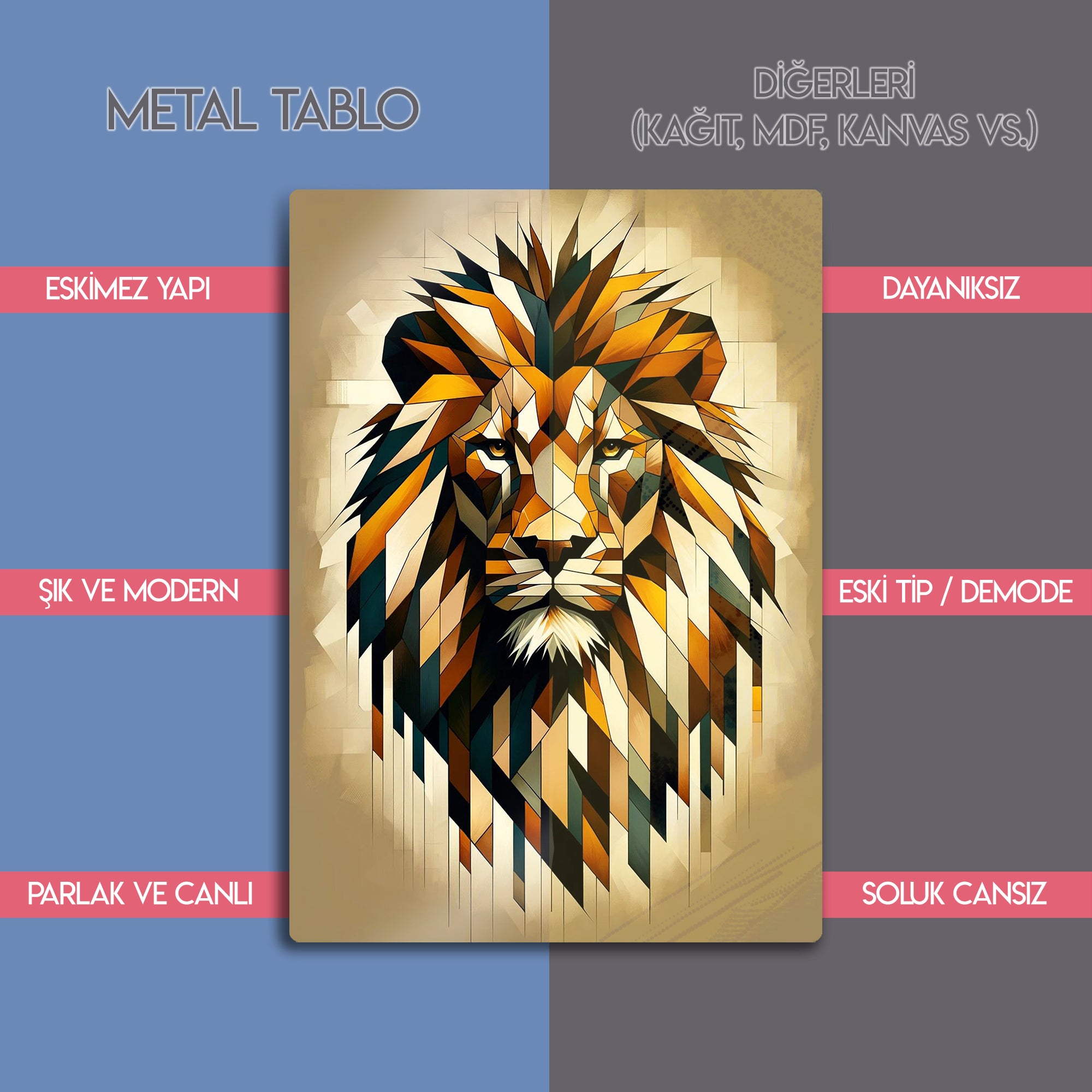 Doğanın en görkemli liderinin gücünü ve asaletini, modern sanatın en keskin çizgileriyle duvarlarınıza taşıyın. Bu olağanüstü metal tablo, bir aslanın karizmatik portresini, yüzlerce geometrik şeklin ve rengin bir araya geldiği, dinamik ve soyut bir kompozisyonla yeniden yorumluyor.
