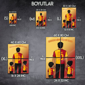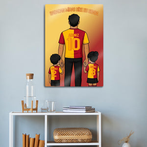 Tablo üzerindeki "ADINIZ" alanlarına, hem babanın hem de çocukların formasına dilediğiniz isimleri ve sizin için anlamlı olan numaraları yazdırarak bu tasarımı tamamen kendinize özel hale getirebilirsiniz. Bu kişiselleştirme, tabloyu sadece size ait kılmakla kalmaz, aynı zamanda onu paha biçilmez bir hediye seçeneğine dönüştürür.