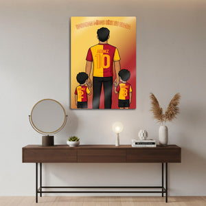 Tablo üzerindeki "ADINIZ" alanlarına, hem babanın hem de iki çocuğun formasına dilediğiniz isimleri ve sizin için anlamlı olan numaraları yazdırarak bu tasarımı tamamen kendinize özel hale getirebilirsiniz. Bu kişiselleştirme, tabloyu sadece size ait kılmakla kalmaz, aynı zamanda onu paha biçilmez bir hediye seçeneğine dönüştürür.