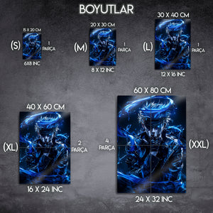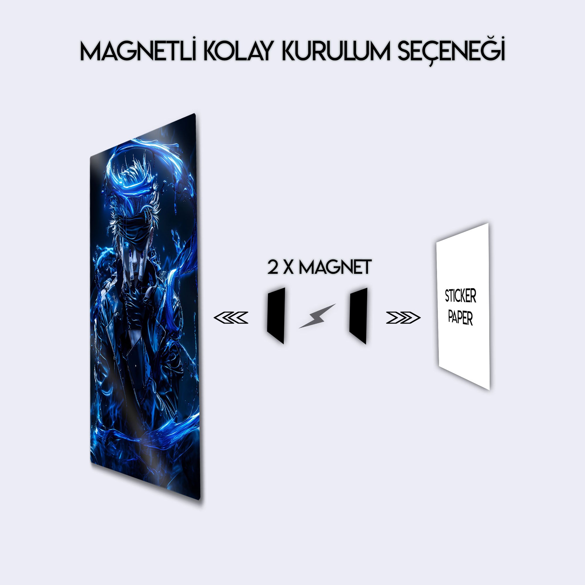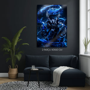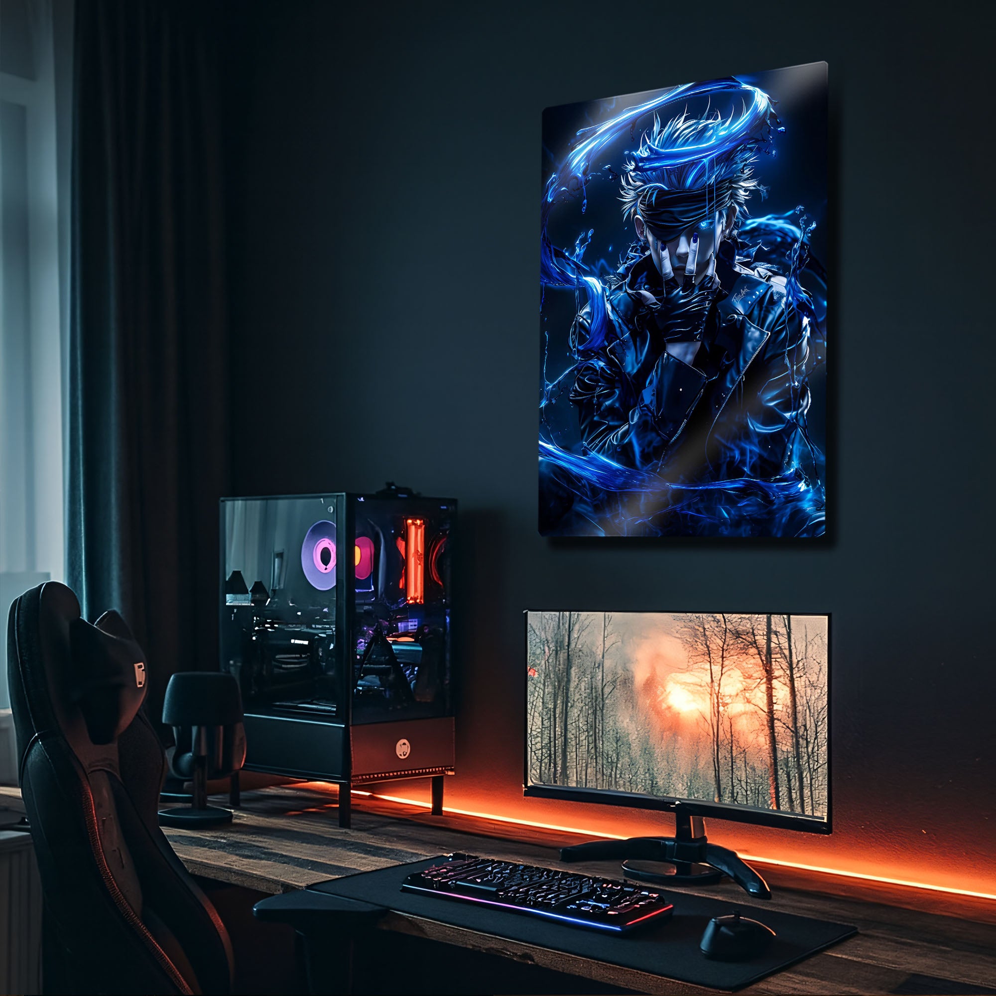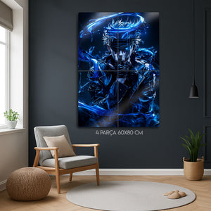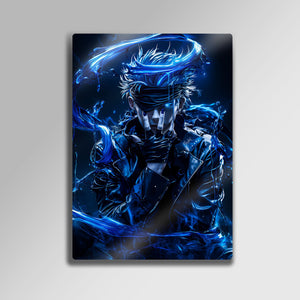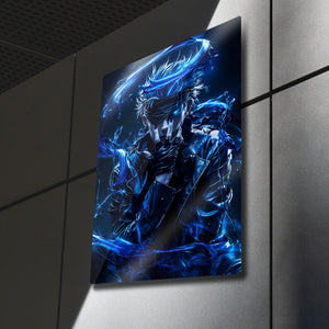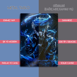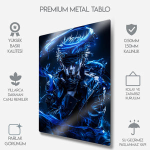 Mavi lanetli enerjinin akışkan ve güçlü tasviri, bu esere hem estetik hem de son derece epik bir atmosfer katıyor. Bu tablo, sadece bir anime posteri değil, aynı zamanda mutlak gücün, karizmanın ve "en güçlü" olmanın bir manifestosudur. Metalin modern dokusu, bu sanatsal tasarımın her bir ışık oyununu ve enerjisini mükemmel bir şekilde öne çıkarır.