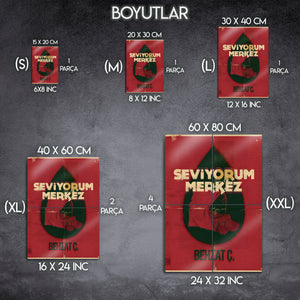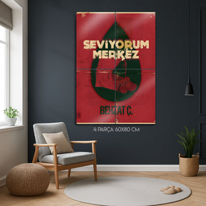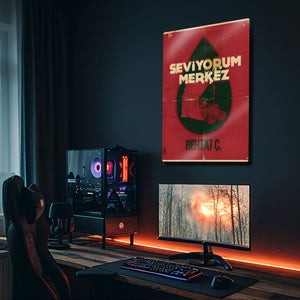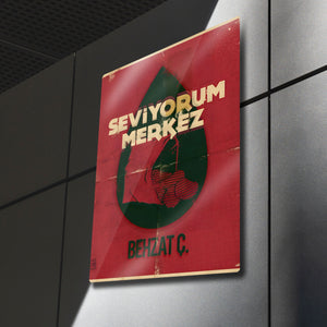 Behzat Ç. Harun Seviyorum Merkez tablosu şimdi sizlerle. Ankara'nın gri ruhunu, adaletin en çiğ ve en gerçek halini duvarlarınıza taşıyın. Bu özel tasarım metal tablo, Türk televizyon tarihinin en unutulmaz anti-kahramanı Başkomiser Behzat Ç.'nin o efsanevi ve anında tanınan "Seviyorum Merkez" anını, minimalist ve güçlü bir propaganda afişi estetiğiyle yeniden yorumluyor.