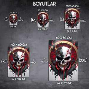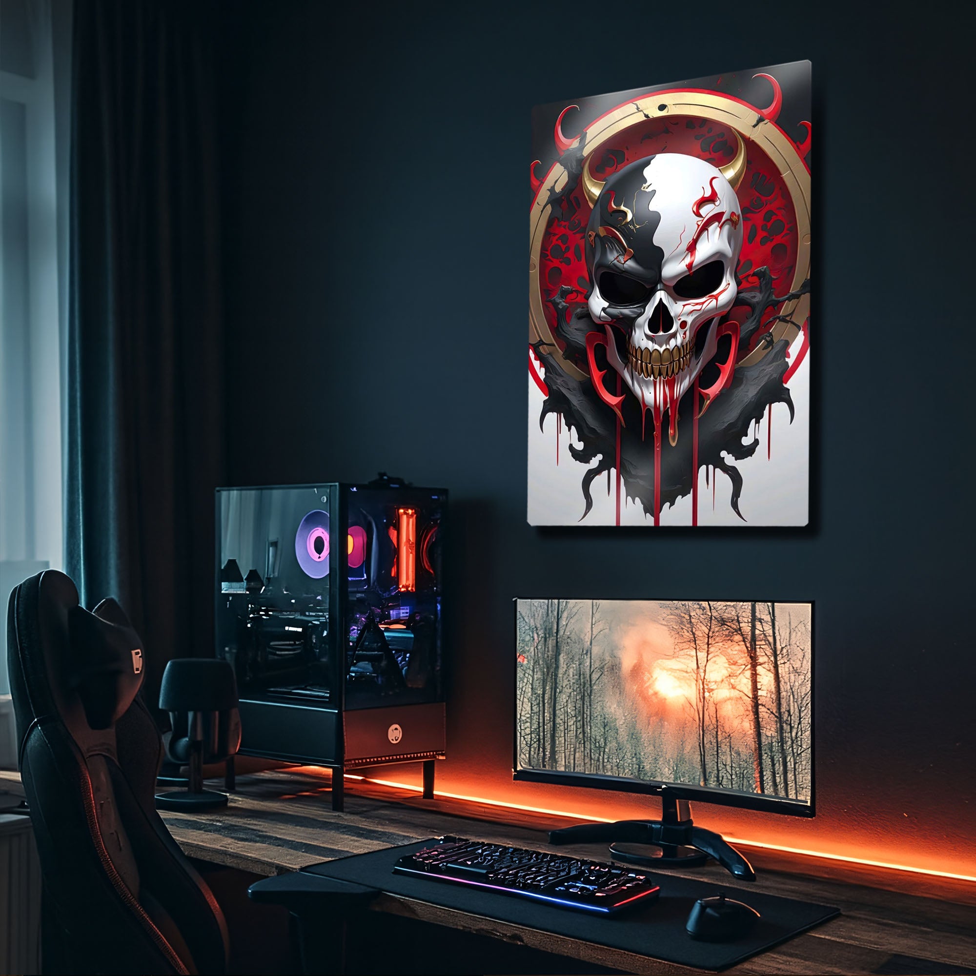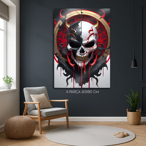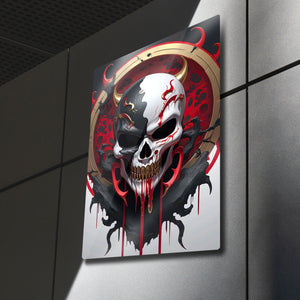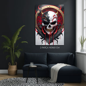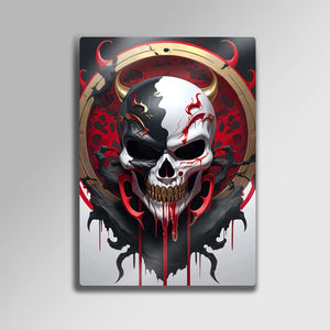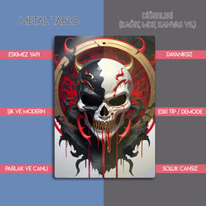 Aydınlık ve karanlığın, iyi ile kötünün savaşını simgeleyen bu gotik başyapıtla duvarlarınıza mistik bir hava katın. Bu olağanüstü metal tablo, Yin-Yang felsefesinden ilham alan, bir yarısı aydınlık bir yarısı karanlık, altın boynuzlu ve kanayan bir kuru kafayı tasvir ediyor. Kırmızı, siyah, beyaz ve altının güçlü renk paleti, bu esere hem lüks hem de şeytani bir estetik kazandırıyor.