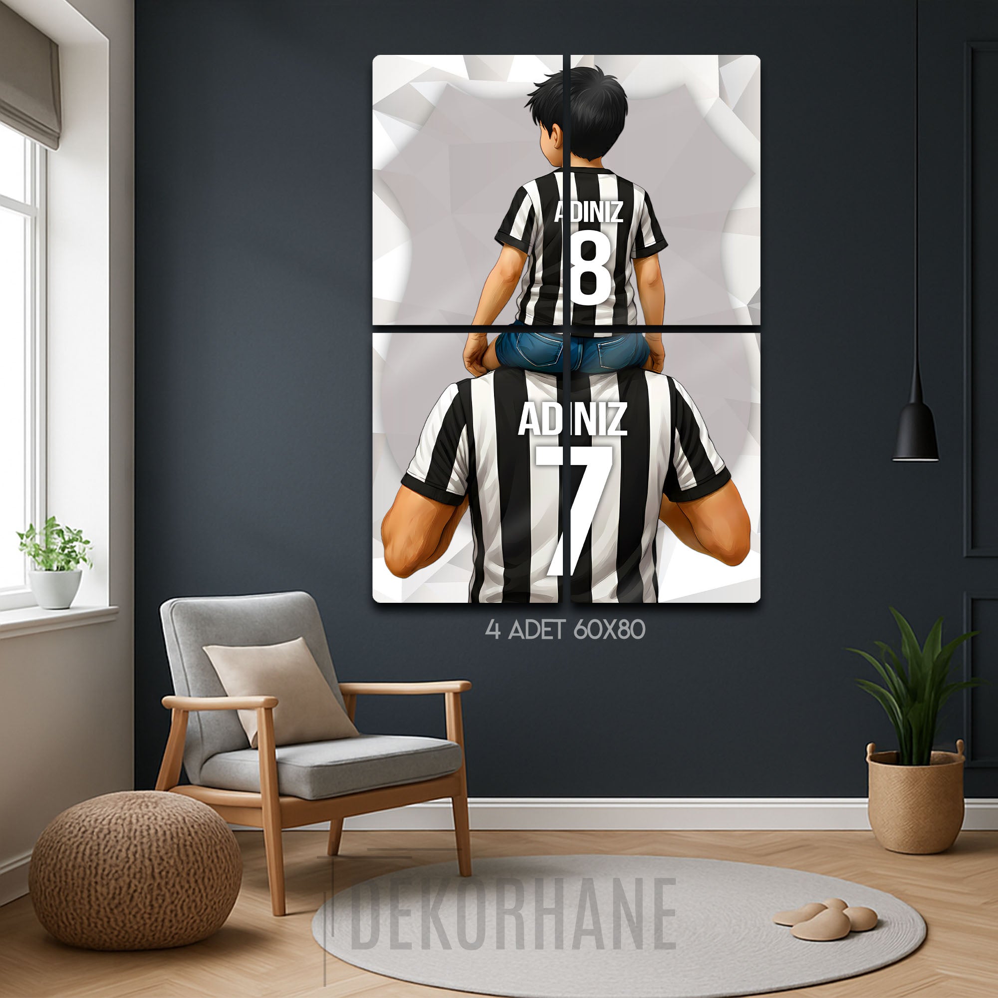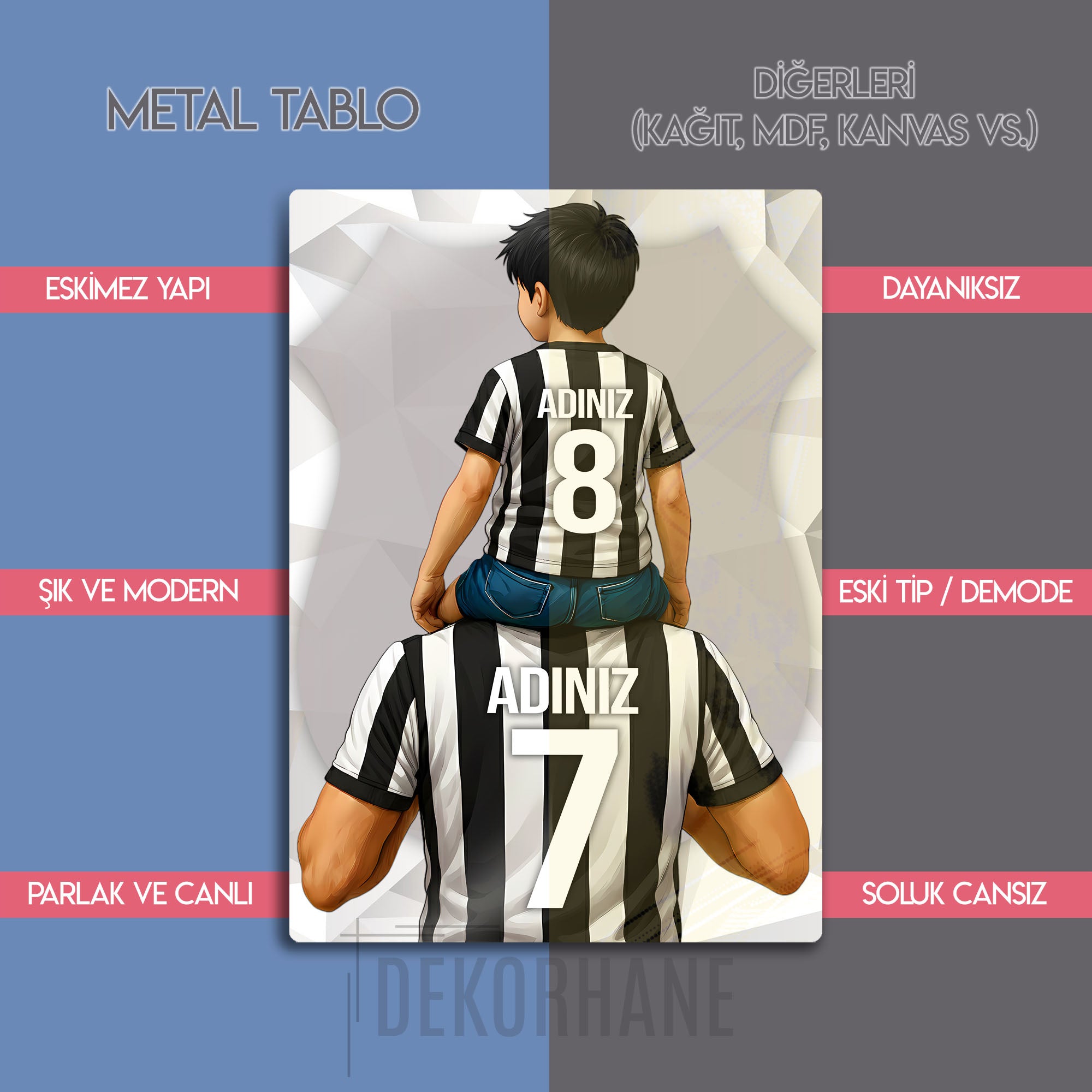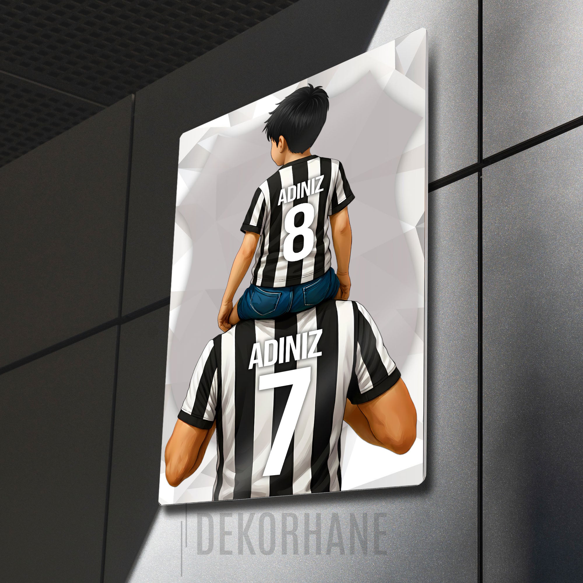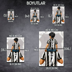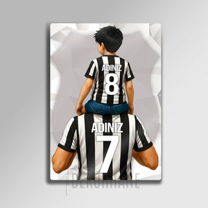 Tablo üzerindeki "ADINIZ" alanlarına, hem baba hem de oğul formasına dilediğiniz isimleri ve sizin için anlamlı olan numaraları yazdırarak bu eşsiz tasarımı tamamen kendinize özel hale getirebilirsiniz. Bu kişiselleştirme, tabloyu sadece size ait kılmakla kalmaz, aynı zamanda onu unutulmaz bir hediye seçeneğine dönüştürür.