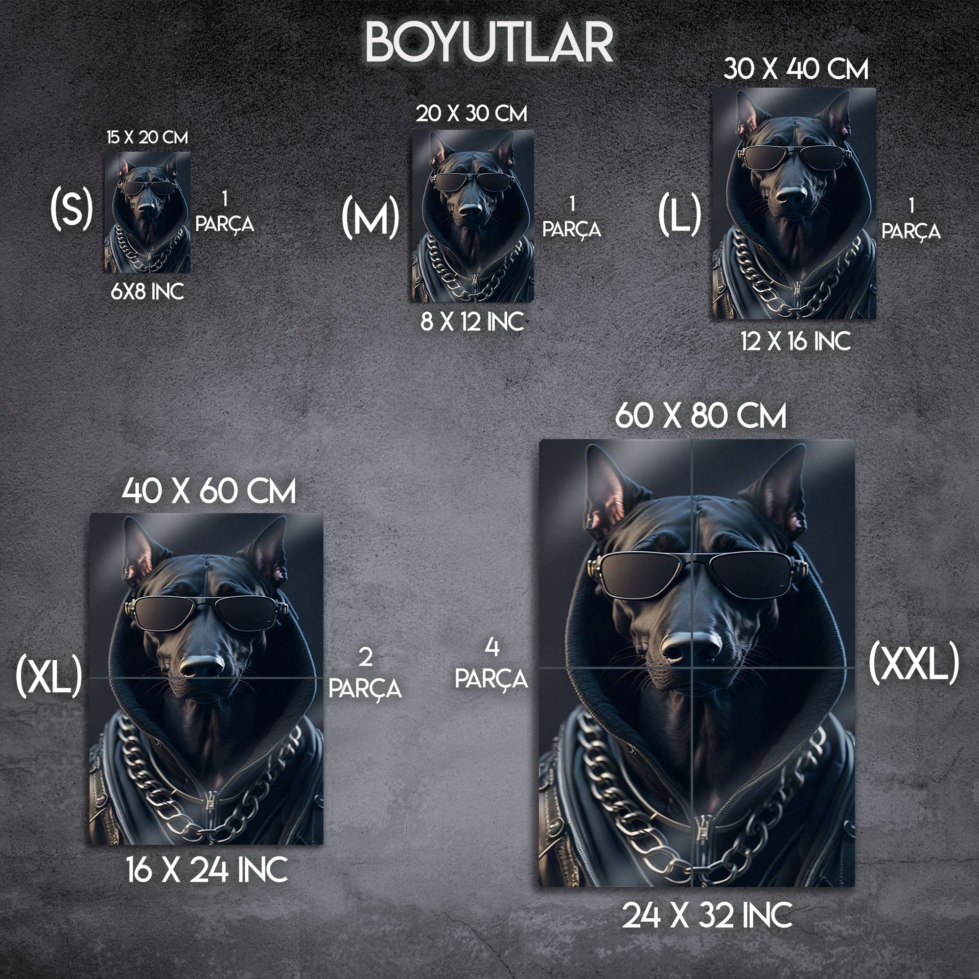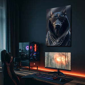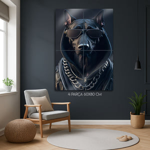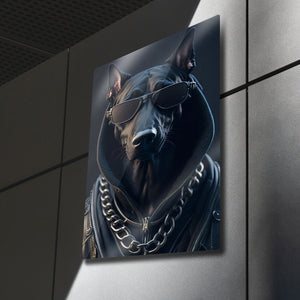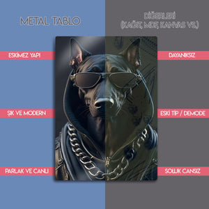 Sokak modasının en karizmatik ve en sadık üyesiyle tanışın! Bu eşsiz metal tablo, güneş gözlükleri, kapüşonlusu, deri ceketi ve kalın zinciriyle tam bir stil ikonu olan havalı bir köpeğin ultra-realist portresini sunuyor. Kendinden emin ve gizemli duruşuyla bu eser, duvarlarınıza anında modern ve cesur bir karakter katacak.