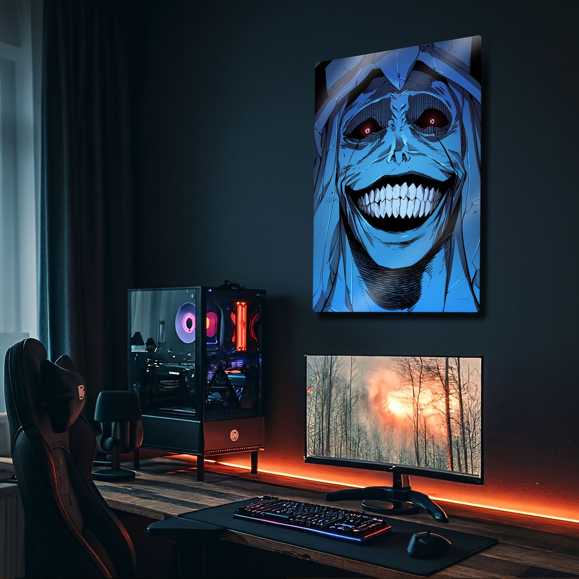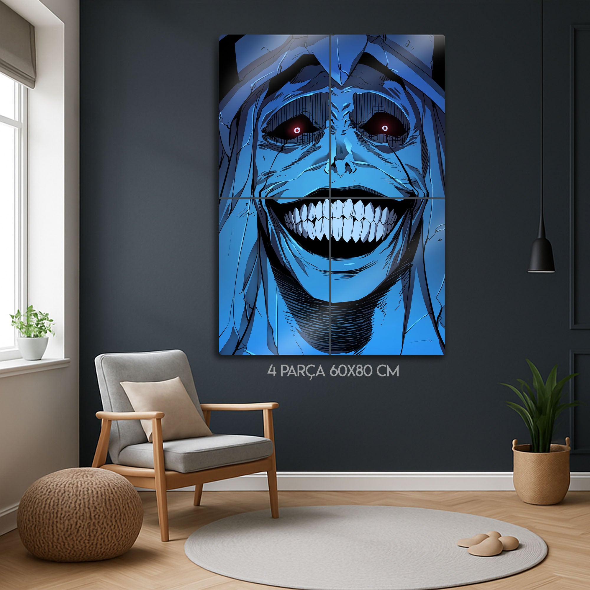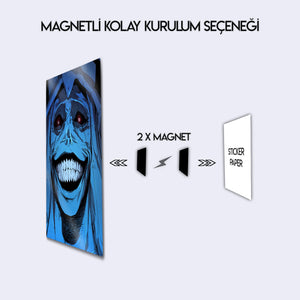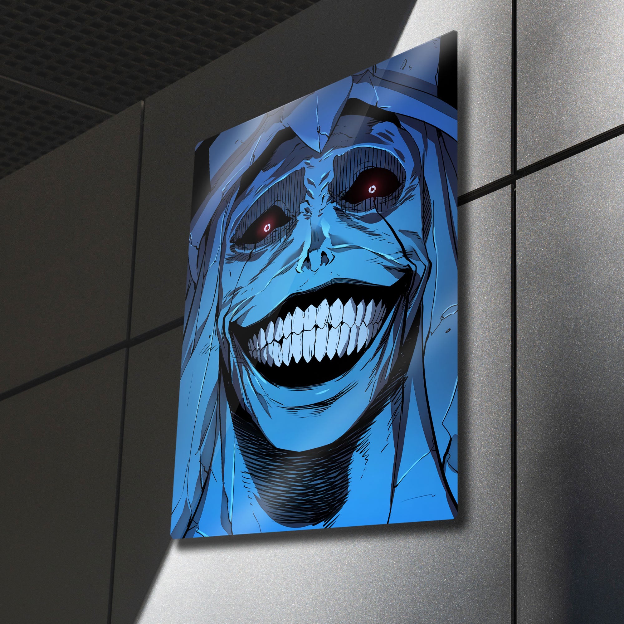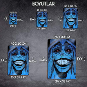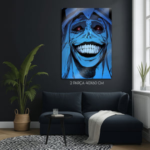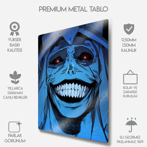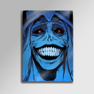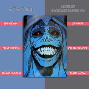 ''Sistemin kurallarına uymayanlar cezalandırılacaktır.'' Manhwa ve webtoon tarihinin en unutulmaz ve en korkutucu anlarından birini duvarlarınıza taşıyın! Bu olağanüstü metal tablo, "Solo Leveling" serisinin o efsanevi "God Statue"sunun (Tanrı Heykeli) o tüyler ürpertici gülüşünü, en ince detaylarıyla ve orijinal renkleriyle ölümsüzleştiriyor.