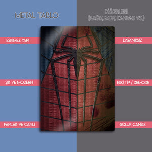 Bir kahramanın sembolünü, en ince detaylarıyla duvarlarınıza taşıyın. Bu olağanüstü metal tablo, "The Amazing Spider-Man" filmlerindeki ikonik kostümün göğüs kısmını, o anında tanınan ve stilize edilmiş örümcek logosuyla birlikte, minimalist ve güçlü bir kompozisyonla sunuyor.
