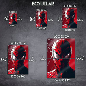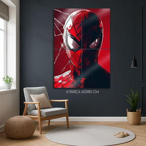 Kırmızının ve siyahın dramatik kontrastı ile arkasındaki kırık ağ efektleri, bu esere hem bir aksiyon hissi hem de karakterin yaşadığı zorlukları simgeleyen bir derinlik katıyor. Bu tablo, sadece bir süper kahraman posteri değil, aynı zamanda bir kahramanın sorumluluğunu ve iç dünyasını yansıtan bir sanat eseridir.