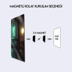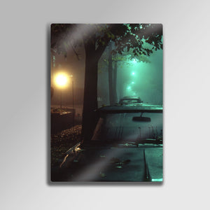 Gecenin gizemini, sisin büyüsünü ve bir metropolün yalnızlığını duvarlarınıza taşıyın. Bu olağanüstü metal tablo, sokak lambalarının aydınlattığı sisli bir gecede park etmiş klasik bir otomobilin o unutulmaz ve atmosferik anını, adeta bir film karesi gibi yakalıyor. Yeşil ve sarı ışıkların sisle dansı, bu esere hem nostaljik hem de son derece sinematik bir hava katıyor.