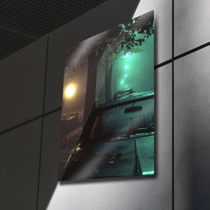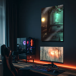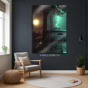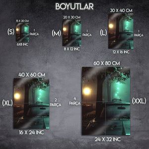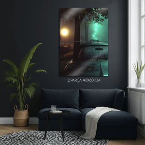 Bu eser, sadece bir manzara fotoğrafı değil, aynı zamanda bir duygu durumunu, bir anın hikayesini ve "film noir" estetiğini yansıtan bir sanat eseridir. Metalin modern dokusu, bu atmosferik sahnenin her bir ışık oyununu, sisin dokusunu ve o anın gizemini mükemmel bir şekilde öne çıkarır. Modern yaşam alanları, ofisler, "man cave"ler veya sinema odaları için mükemmel bir "statement" parçasıdır.