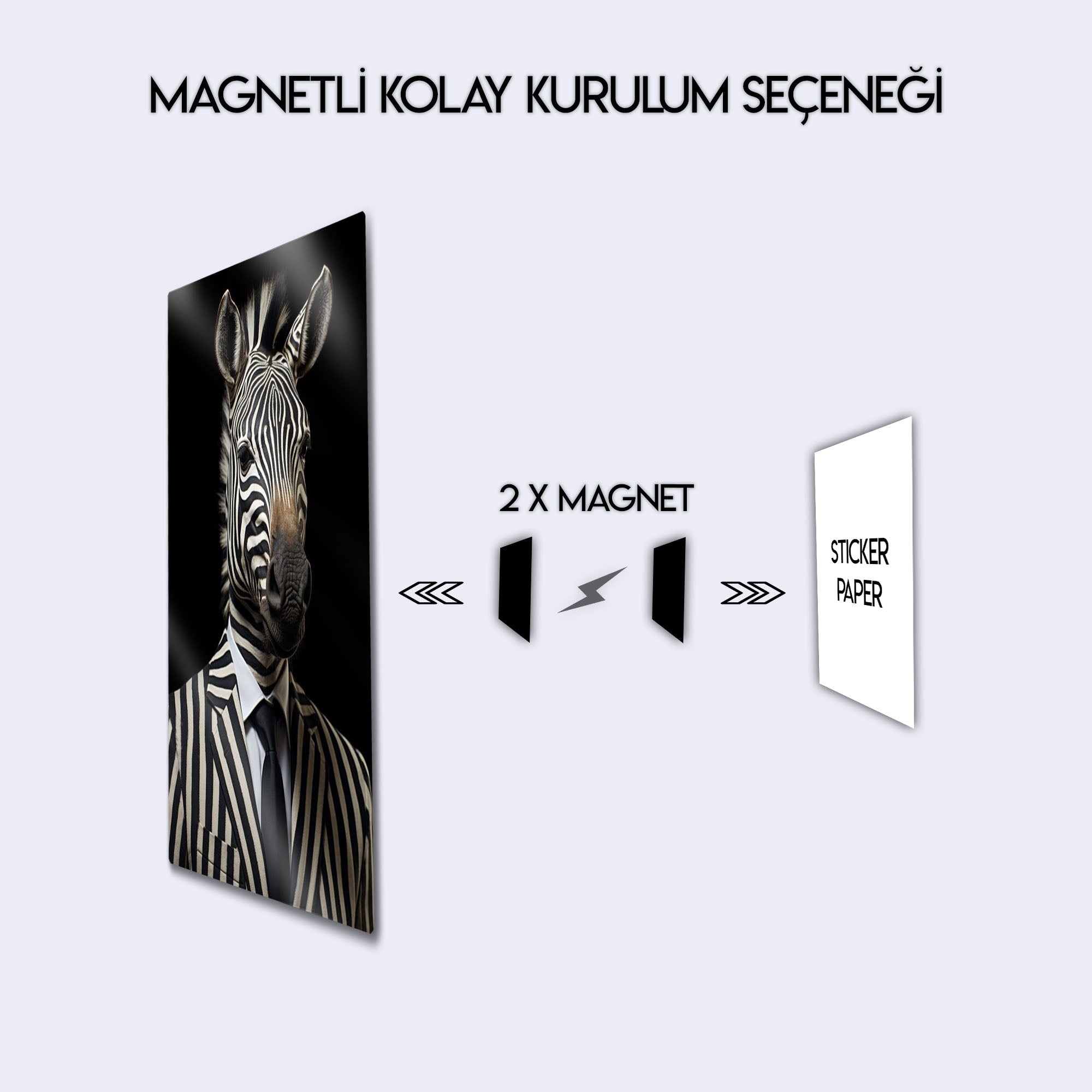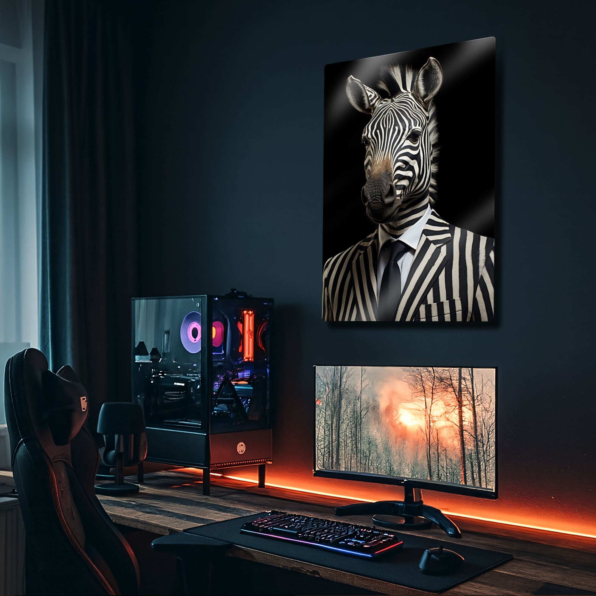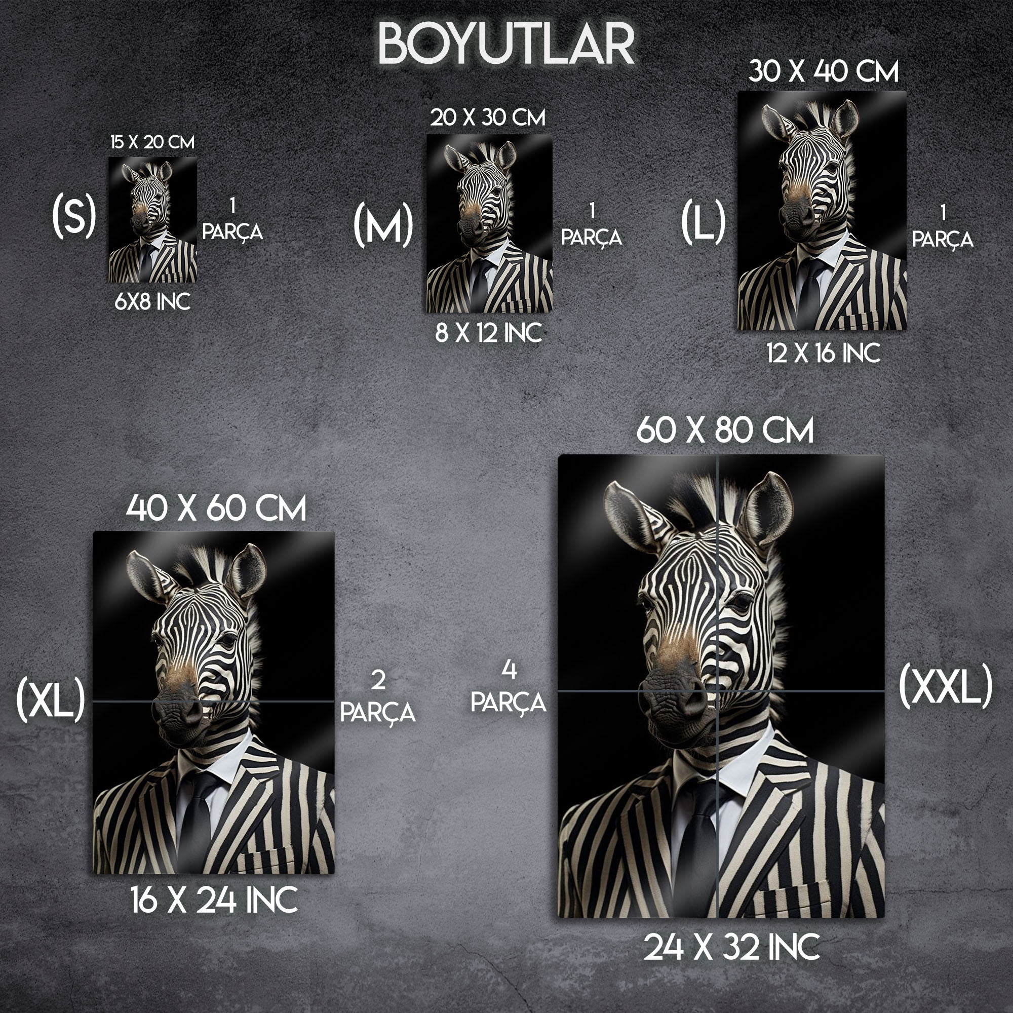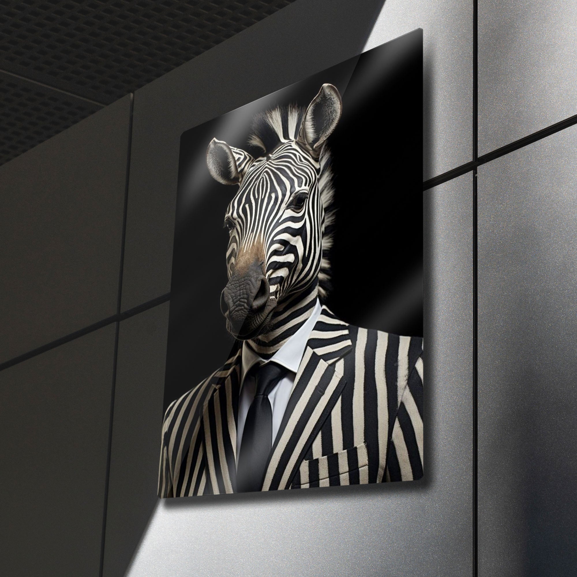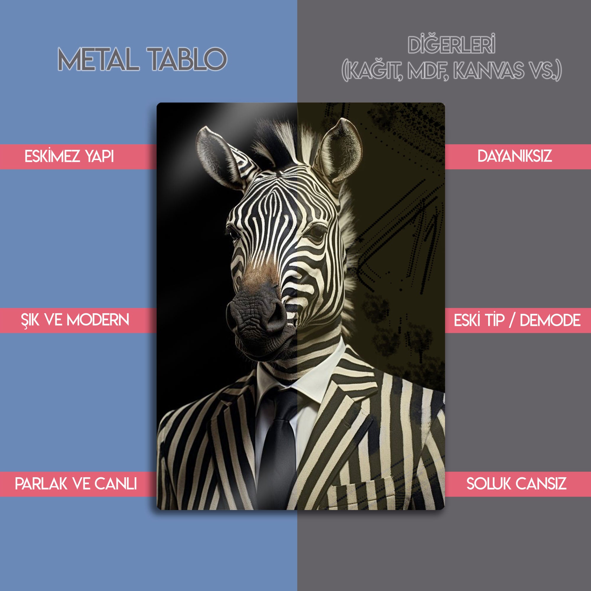 Sıradanlıktan sıyrılın ve vahşi doğanın en stil sahibi beyefendisiyle tanışın! Bu olağanüstü metal tablo, takım elbisesi ve kravatıyla tam bir centilmen gibi poz veren bir zebranın, ultra-realist ve bir o kadar da sürreal portresini sunuyor.