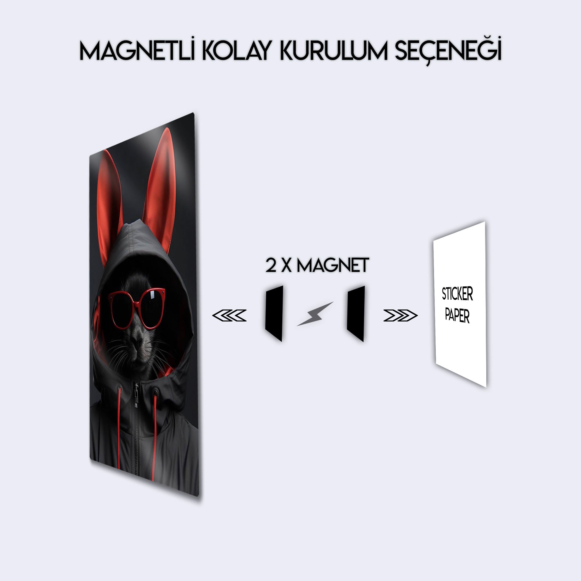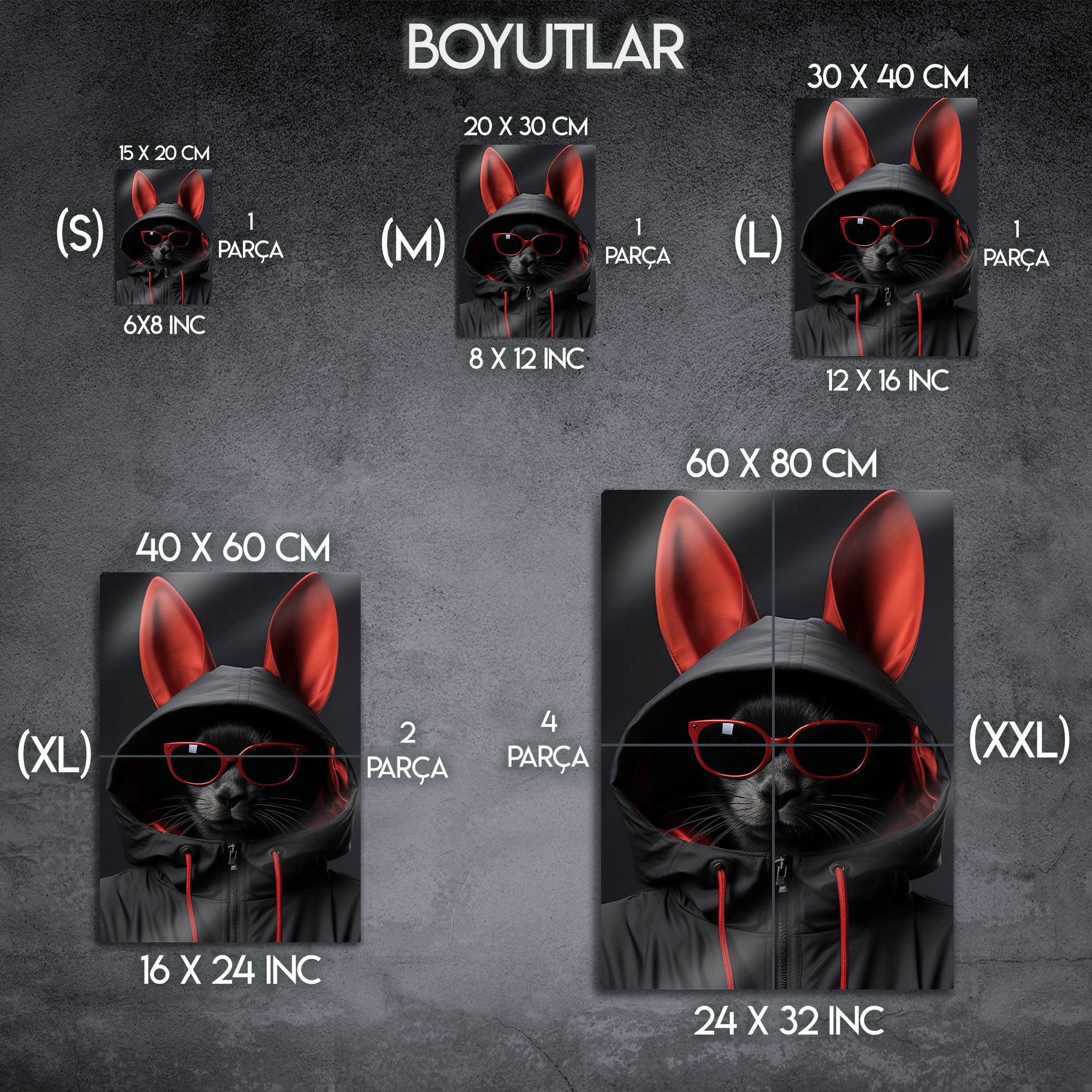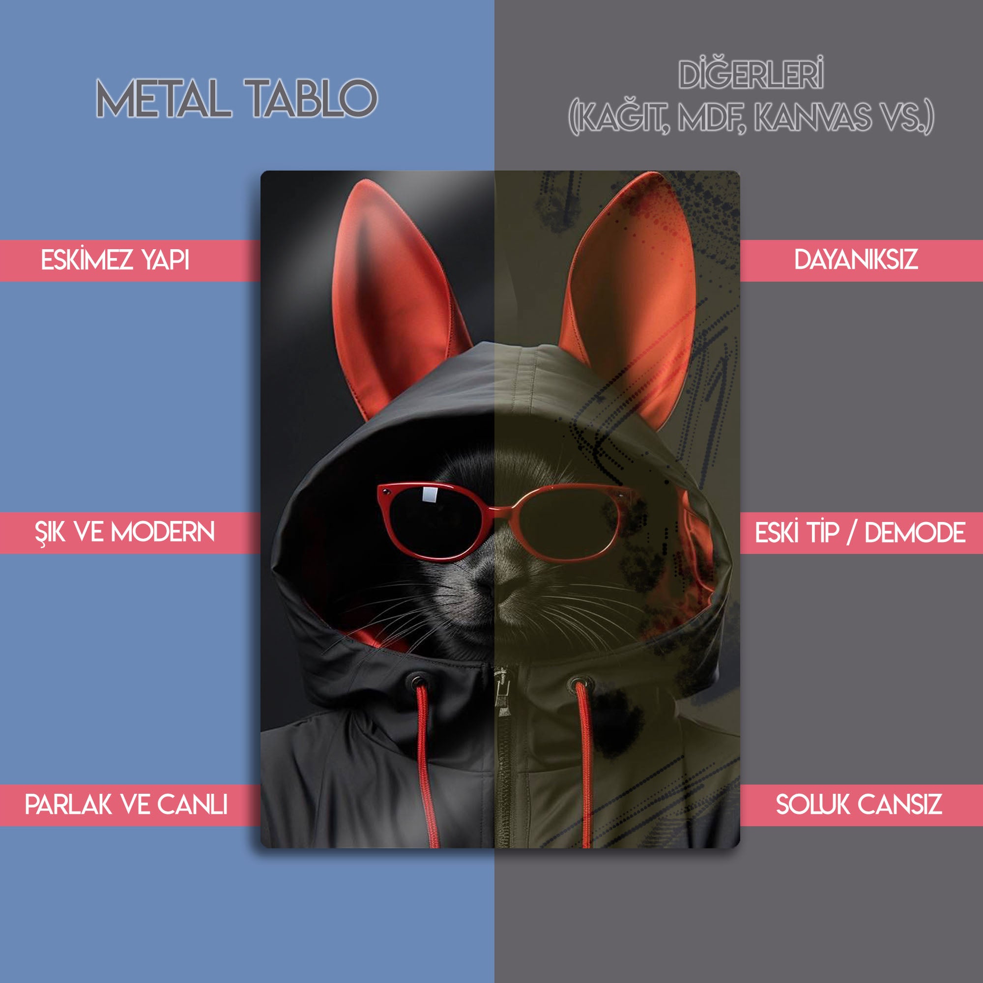 Stilin ve sevimliliğin en havalı birleşimi! Bu olağanüstü metal tablo, kırmızı gözlükleri, tavşan kulaklı kapüşonlusu ve umursamaz tavrıyla tam bir stil ikonu olan bir siyah kedinin ultra-realist portresini sunuyor. Kırmızı ve siyahın çarpıcı kontrastı, bu esere hem modern hem de son derece karizmatik bir hava katıyor.