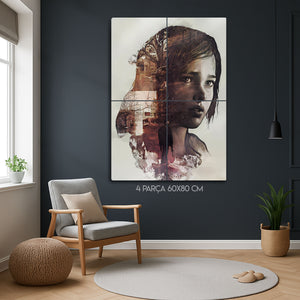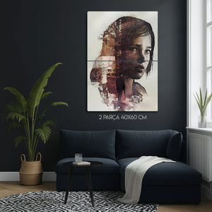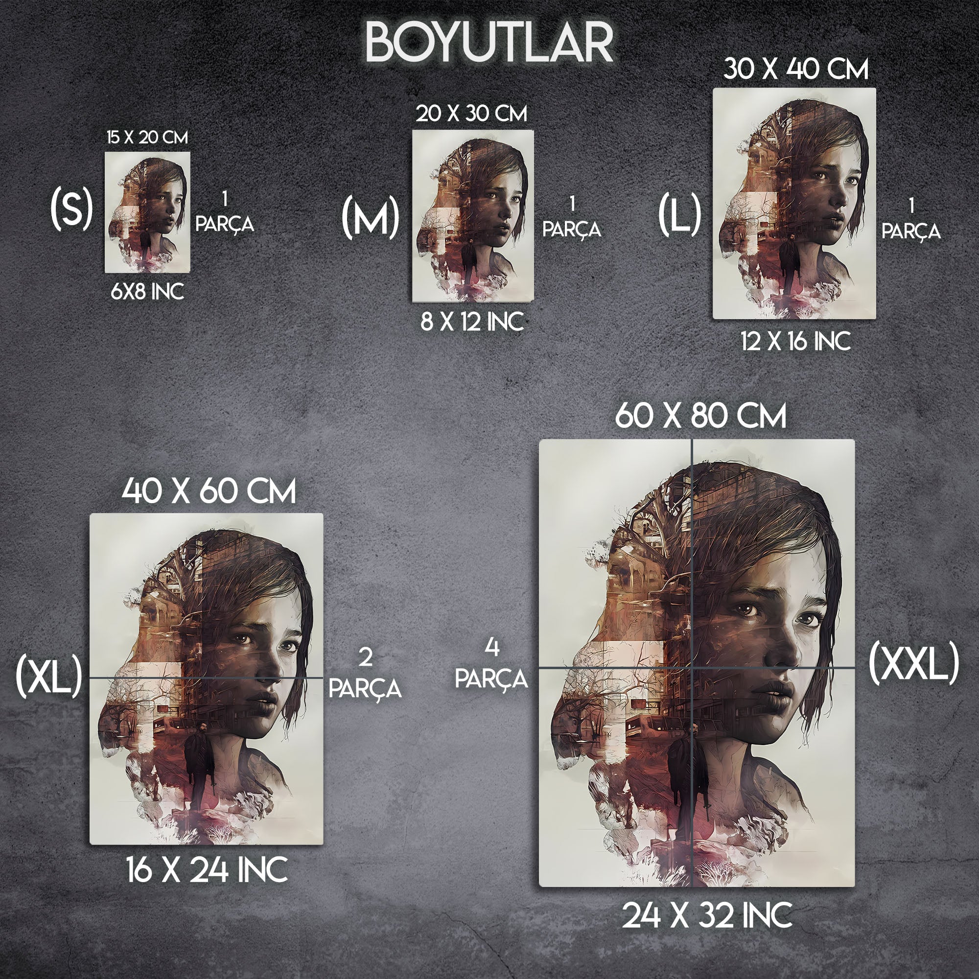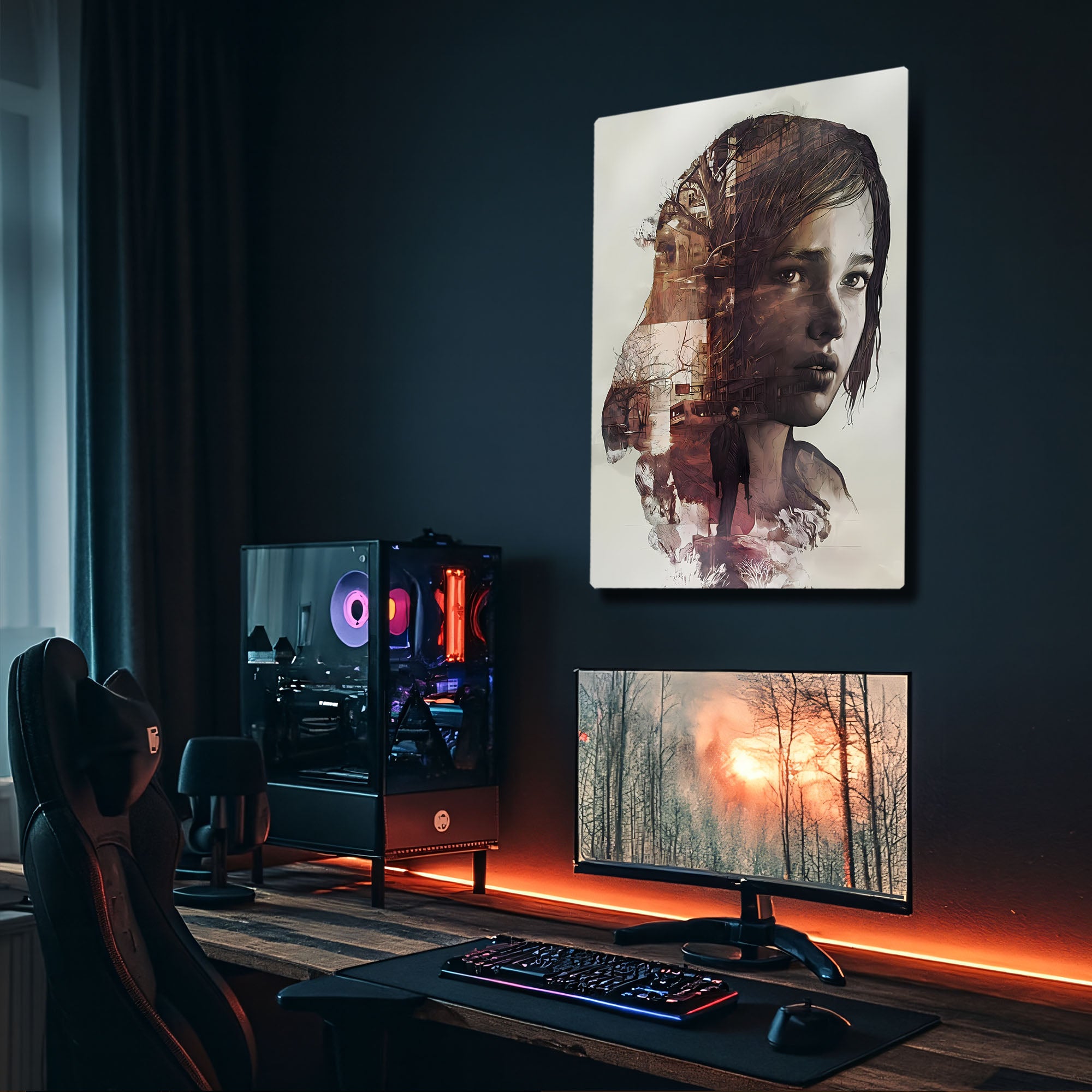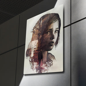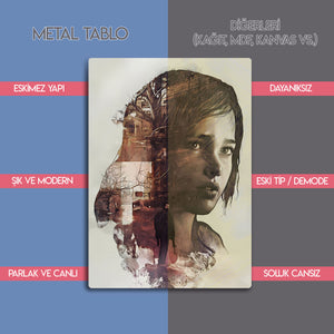 Oyun dünyasının en dokunaklı hikayelerinden birini duvarlarınızda sergileyin. Bu olağanüstü metal tablo, The Last of Us'ın kalbi olan Ellie'nin portresini, onun ve Joel'in post-apokaliptik Amerika'daki zorlu yolculuklarından sahnelerle birleştiren sanatsal bir "double exposure" tekniğiyle sunuyor.