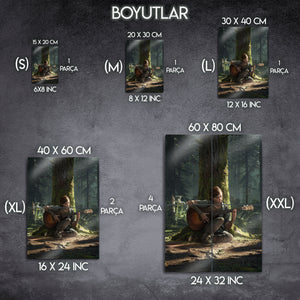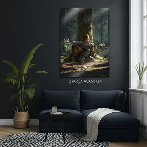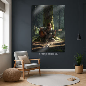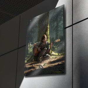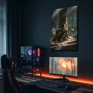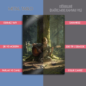 Oyun dünyasının en derin ve en unutulmaz karakterlerinden Ellie'nin o ikonik anını duvarlarınızda ölümsüzleştirin. Bu olağanüstü metal tablo, The Last of Us Part 2'nin o hüzünlü ve umut dolu atmosferini, Ellie'nin ormanın huzurunda gitarıyla baş başa kaldığı o güçlü sahneyle yakalıyor.