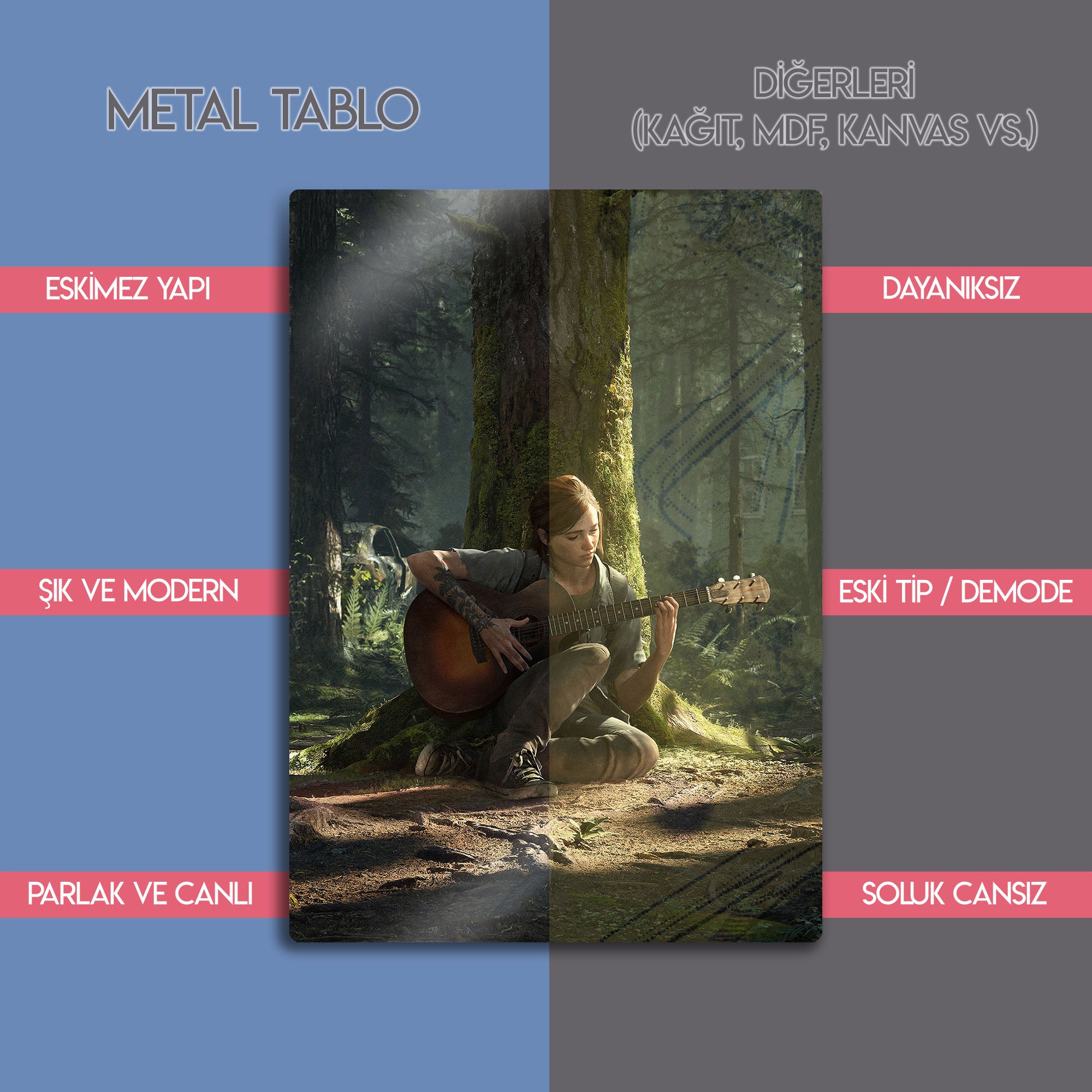 Bu eser, sadece bir oyun posteri değil, aynı zamanda hayatta kalma, kayıp ve insan ruhunun karmaşıklığı üzerine bir sanat eseridir. Yüksek çözünürlüklü baskı kalitesi, ormanın her detayını, ağaçtan sızan ışık huzmelerini ve Ellie'nin yüzündeki o yoğun ifadeyi metalin modern dokusuyla birleştirerek adeta canlandırıyor. Oyun odaları, salonlar, stüdyolar veya modern yaşam alanlarına anında bir derinlik ve sanatsal bir atmosfer katacaktır.
