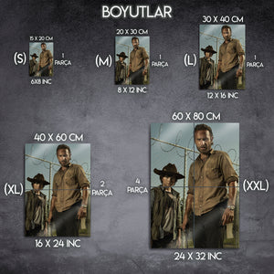 ''We are the walking dead!'' ("Yürüyen ölüler biziz!") Kıyamet sonrası bir dünyanın en unutulmaz hayatta kalma mücadelesini ve bir baba-oğulun o sarsılmaz bağını duvarlarınıza taşıyın. Bu olağanüstü metal tablo, "The Walking Dead"in efsanevi lideri Rick Grimes ve oğlu Carl'ı, dizinin en ikonik dönemlerinden biri olan hapishane sığınağının önünde, o yorgun ama kararlı halleriyle ölümsüzleştiriyor.