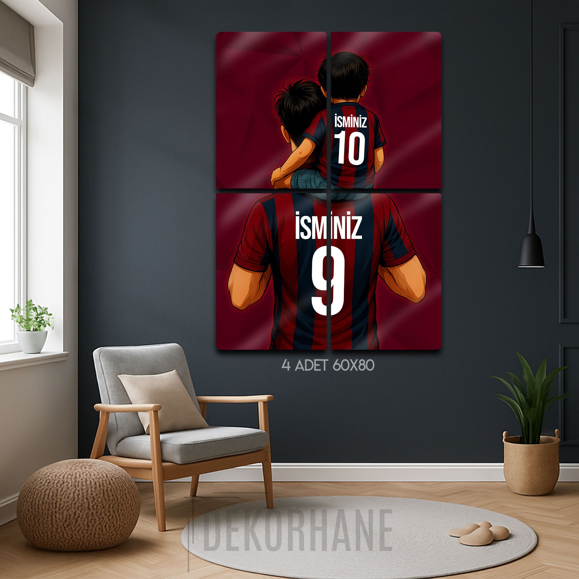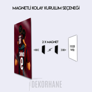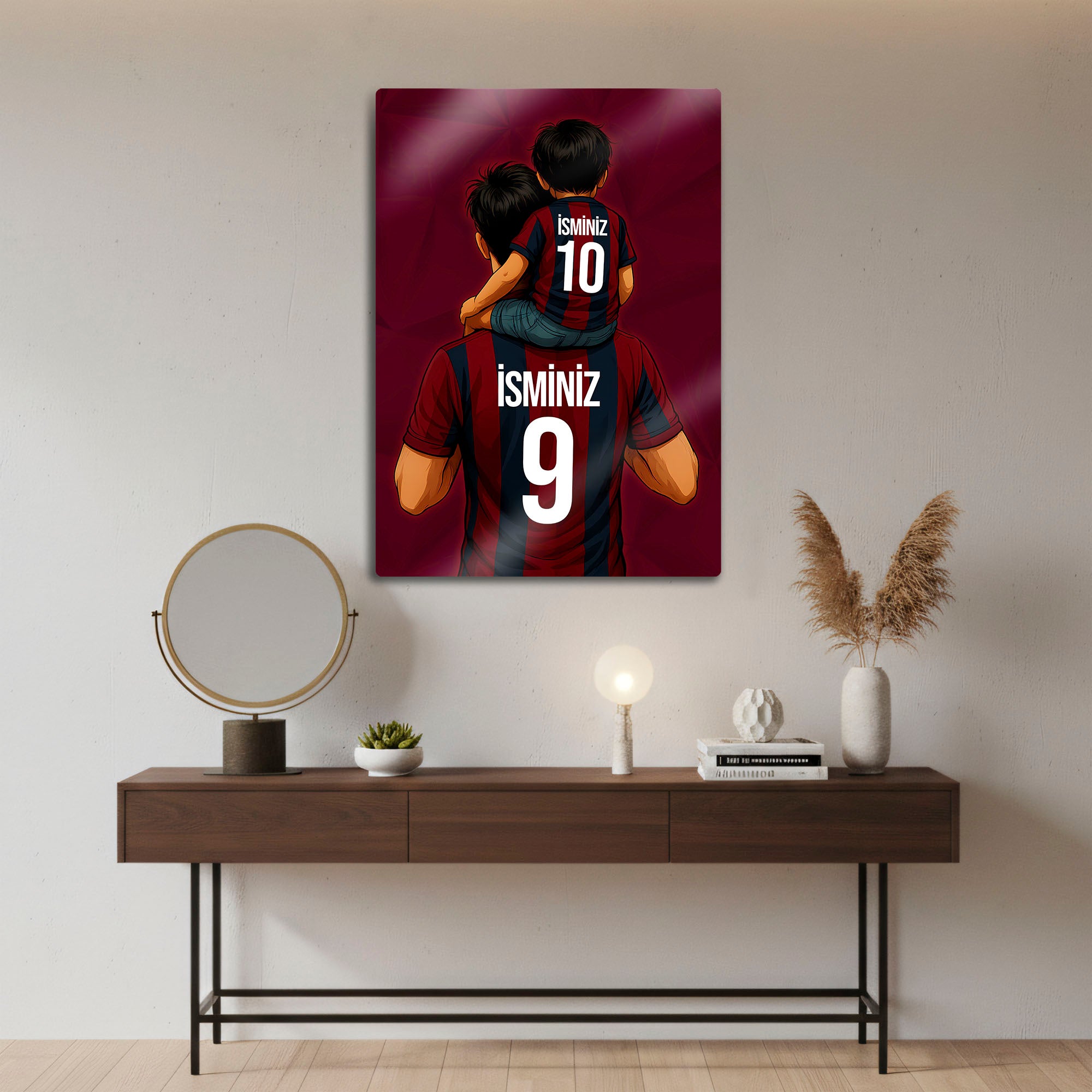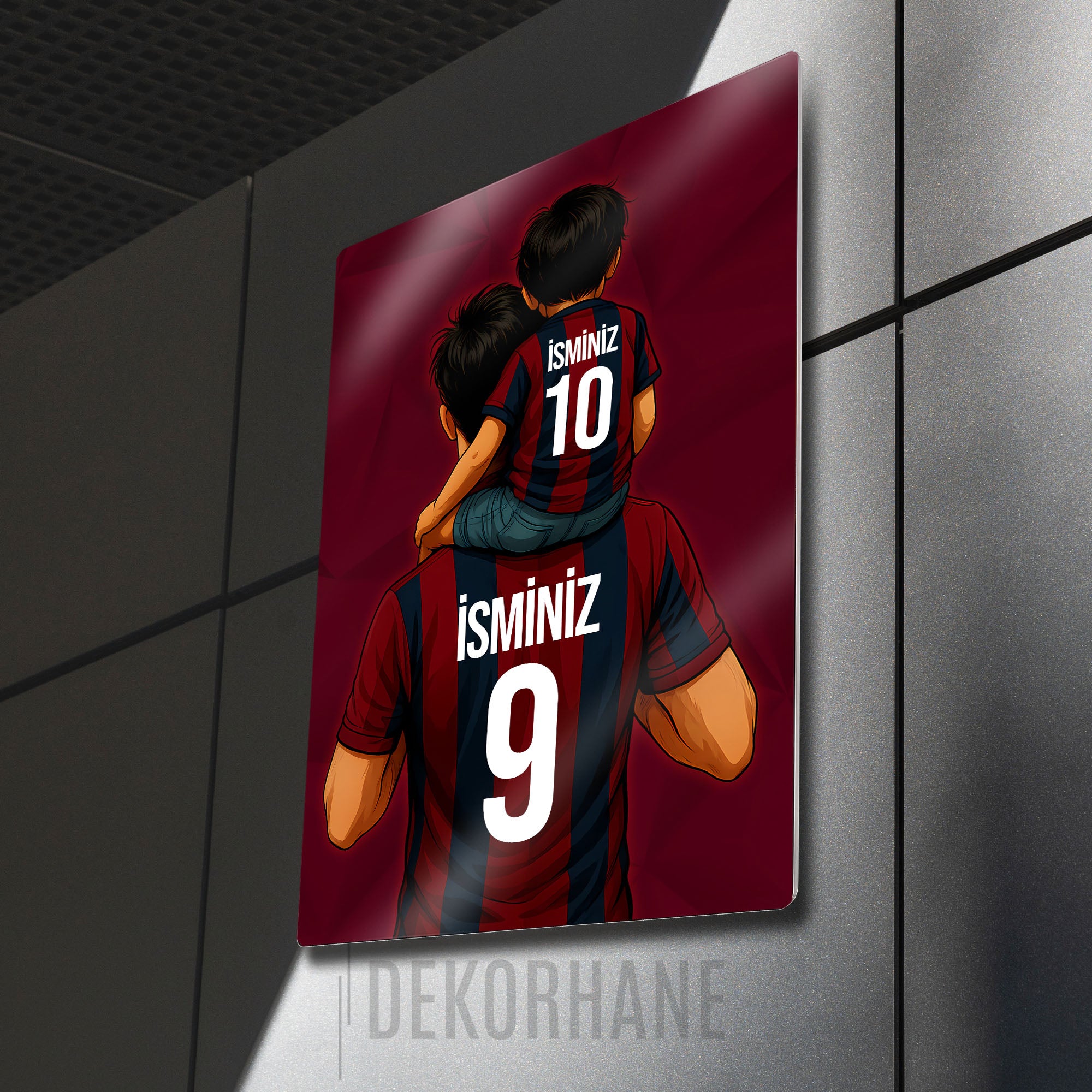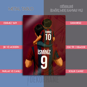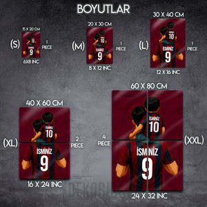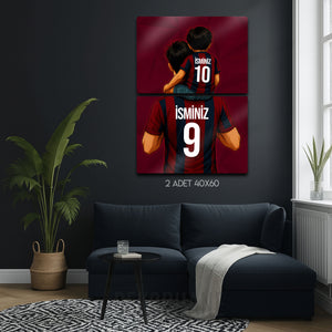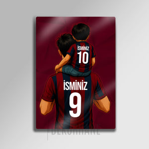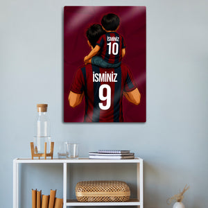 Tablo üzerindeki "İSMİNİZ" alanlarına, hem baba hem de oğul formasına dilediğiniz isimleri ve sizin için anlamlı olan numaraları yazdırarak bu tasarımı tamamen kendinize özel hale getirebilirsiniz. Bu kişiselleştirme, tabloyu sadece size ait kılmakla kalmaz, aynı zamanda onu unutulmaz bir hediye seçeneğine dönüştürür.