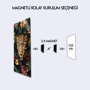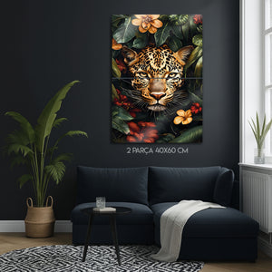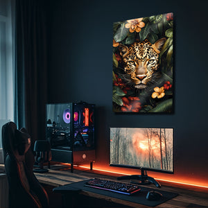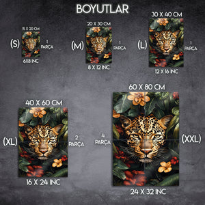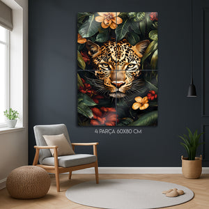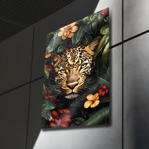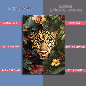 Ormanın derinliklerinden gelen o hipnotize edici bakış... Bu sanatsal metal tablo, vahşi bir leoparın karizmatik ve gizemli yüzünü, yemyeşil tropik yapraklar ve canlı renkteki egzotik çiçeklerin arasında sergiliyor. Doğanın ham gücü ile floral estetiğin bu eşsiz buluşması, duvarlarınıza hem bir macera ruhu hem de sofistike bir zarafet katıyor.