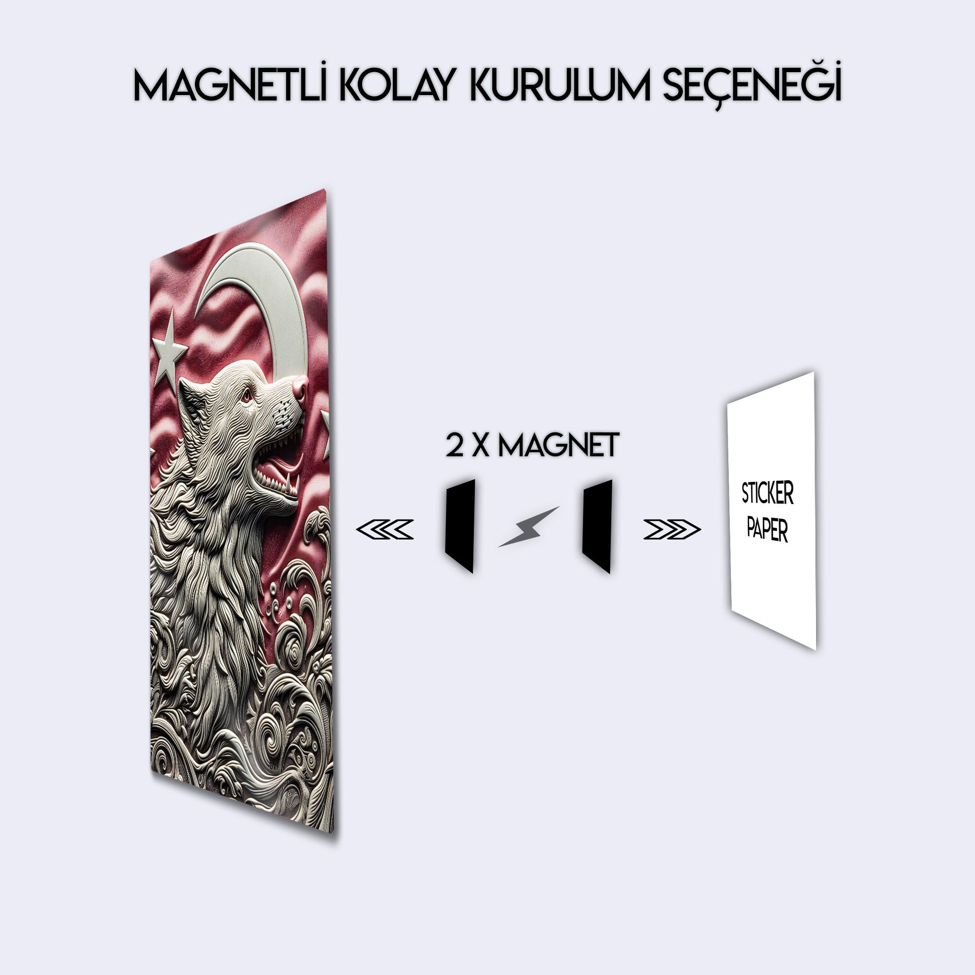Türk'ün sarsılmaz ruhu ve ataların mirası, sanatsal bir başyapıtta buluşuyor! Bu olağanüstü metal tablo, Türk mitolojisinde yol göstericiliği, gücü ve özgürlüğü simgeleyen Bozkurt'u, şanlı Ay Yıldızlı bayrağımızın önünde adeta bir anıt gibi yükselen, üç boyutlu bir tasvirle sunuyor.