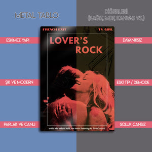 ''While the others talk, we were listening to Lover's Rock...'' Indie pop'un kült grubu TV Girl'ün o hipnotik ve nostaljik şarkısı "Lover's Rock"ın ruhunu duvarlarınıza taşıyın. Bu özel tasarım metal tablo, şarkının melankolik ve romantik atmosferini, retro bir film afişini andıran minimalist bir estetikle sunuyor.