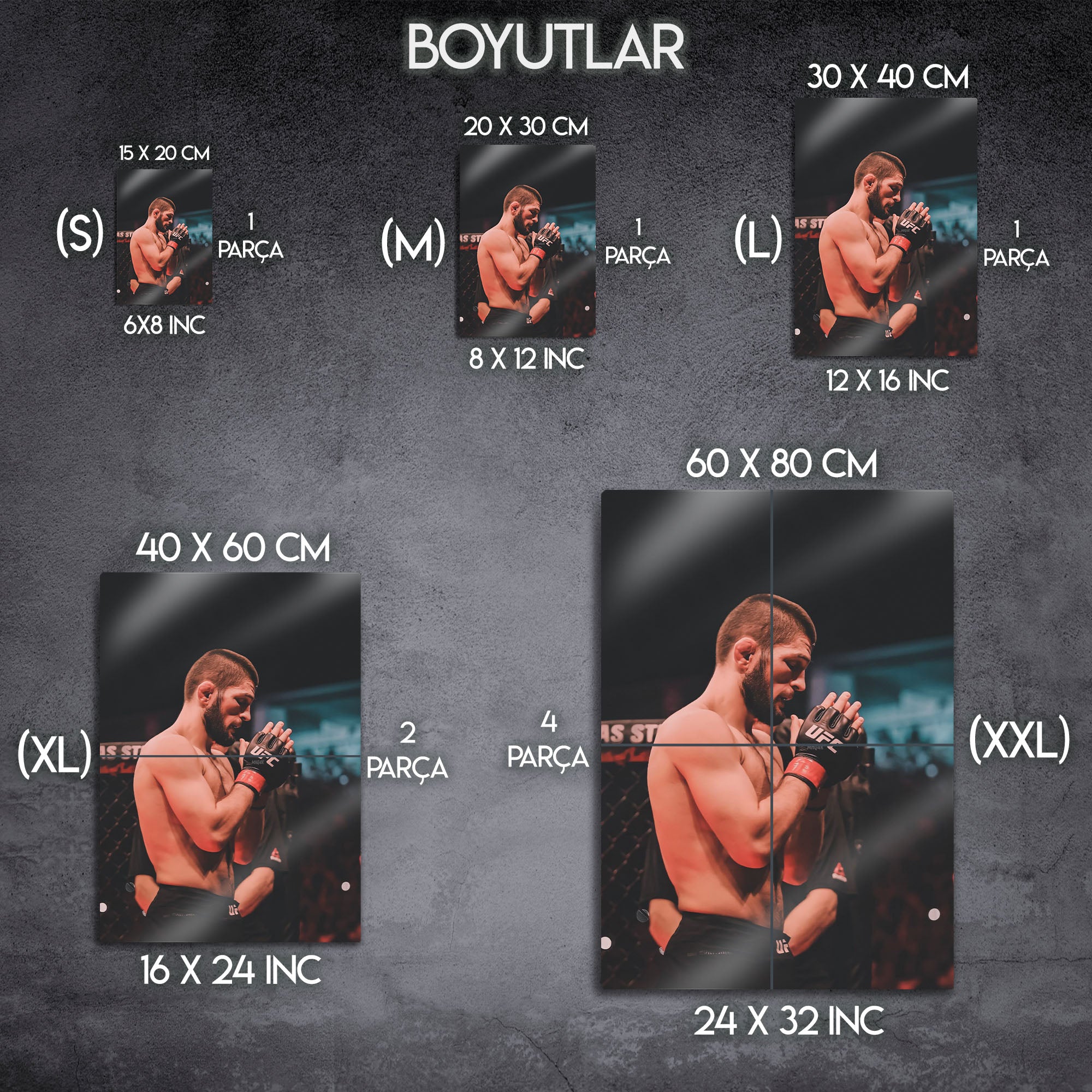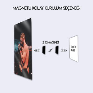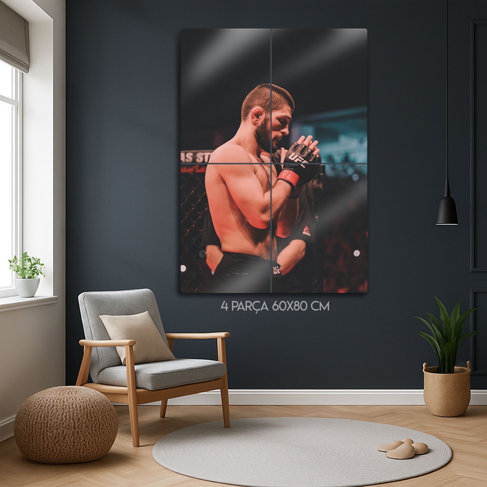 Efsanevi UFC dövüşçüsü Khabib Nurmagomedov temalı bu özel metal tablo, dövüş sporları tutkunları için eşsiz bir dekoratif üründür. MMA ve UFC dünyasının en unutulmaz isimlerinden Khabib’in ringdeki ikonik duruşunu yansıtan bu tasarım, spor salonları, genç odaları, ofisler veya koleksiyon köşeleri için mükemmel bir seçimdir. Yüksek kaliteli baskısı ve dayanıklı metal yüzeyi sayesinde uzun yıllar ilk günkü gibi kalır. Dövüş sporu seven arkadaşlarınıza da özel bir hediye alternatifi sunar.