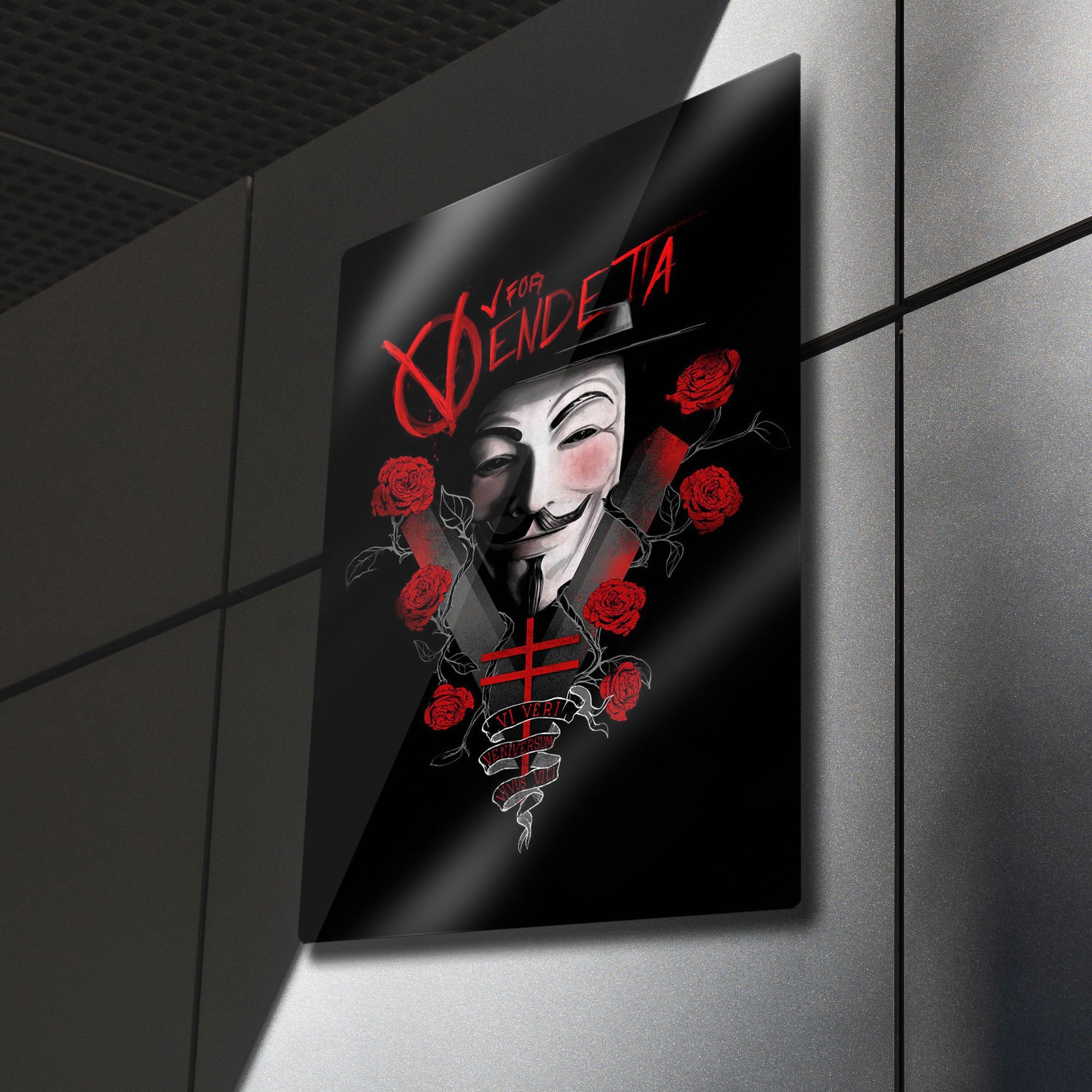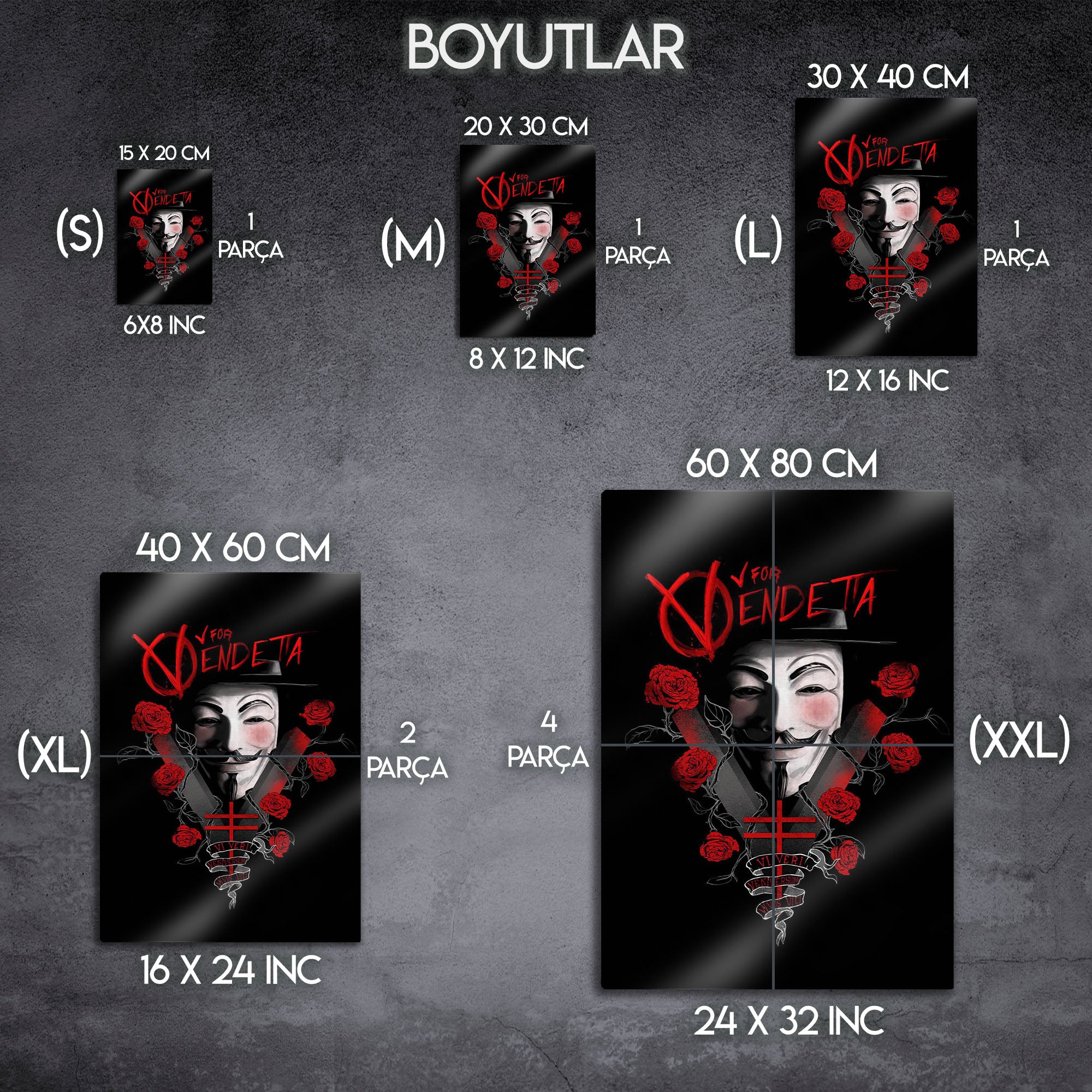 ''Bu maskenin altında bir yüzden fazlası var. Bu maskenin altında bir fikir var, Bay Creedy. Ve fikirlere kurşun işlemez!'' Özgürlüğün, isyanın ve fikirlerin ölümsüzlüğünün sembolü olan "V for Vendetta"nın o unutulmaz ruhunu duvarlarınıza taşıyın. Bu özel tasarım metal tablo, Guy Fawkes maskesinin gizemini, Scarlet Carson güllerinin romantizmini ve "V"nin anarşist felsefesini, modern bir "tattoo art" (dövme sanatı) estetiğiyle birleştiriyor.