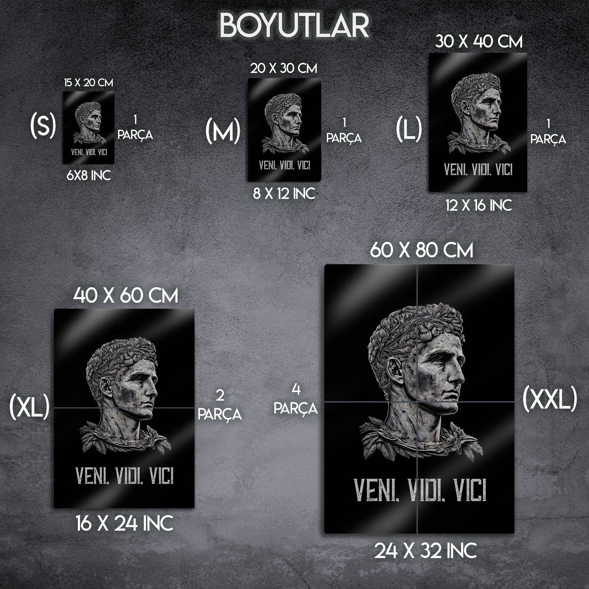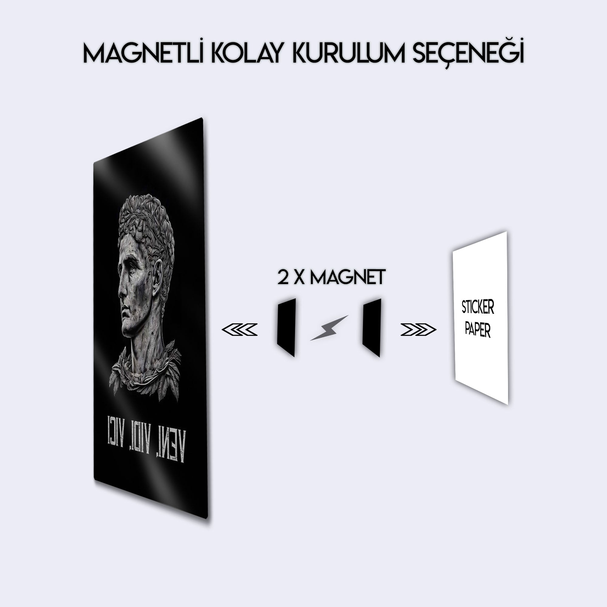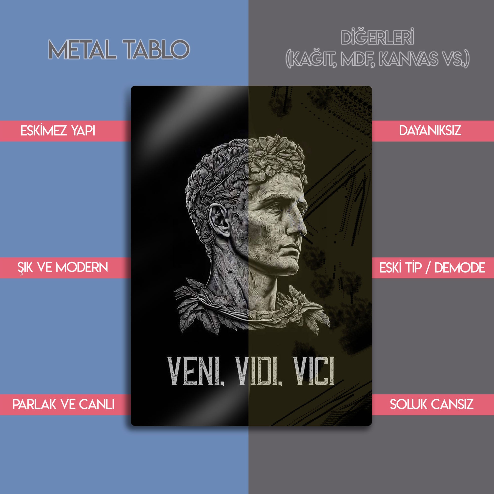 ''Veni, Vidi, Vici!'' ("Geldim, Gördüm, Yendim!") Tarihin en büyük askeri ve politik dehalarından biri olan Jül Sezar'ın o sarsılmaz iradesini ve kararlılığını duvarlarınıza taşıyın. Bu olağanüstü metal tablo, Sezar'ın ikonik büstünü, modern bir gravür (oyma) sanatını andıran bir estetikle ve tarihe kazınmış o meşhur sözüyle birleştiriyor.