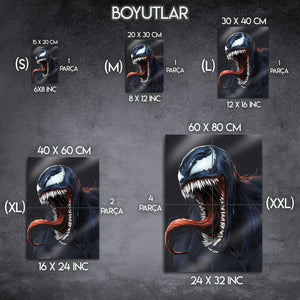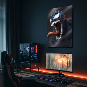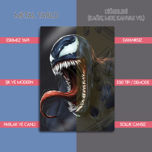 ''We... are Venom!'' ("Biz... Venom'uz!") Marvel evreninin en ikonik ve en tehlikeli simbiyotunun o ham ve dizginlenemez gücünü duvarlarınıza taşıyın. Bu olağanüstü metal tablo, Venom'un o korkutucu ve bir o kadar da karizmatik portresini, keskin dişleri, uzun dili ve karanlık aurasıyla, nefes kesici bir hiper-realizmle yakalıyor.