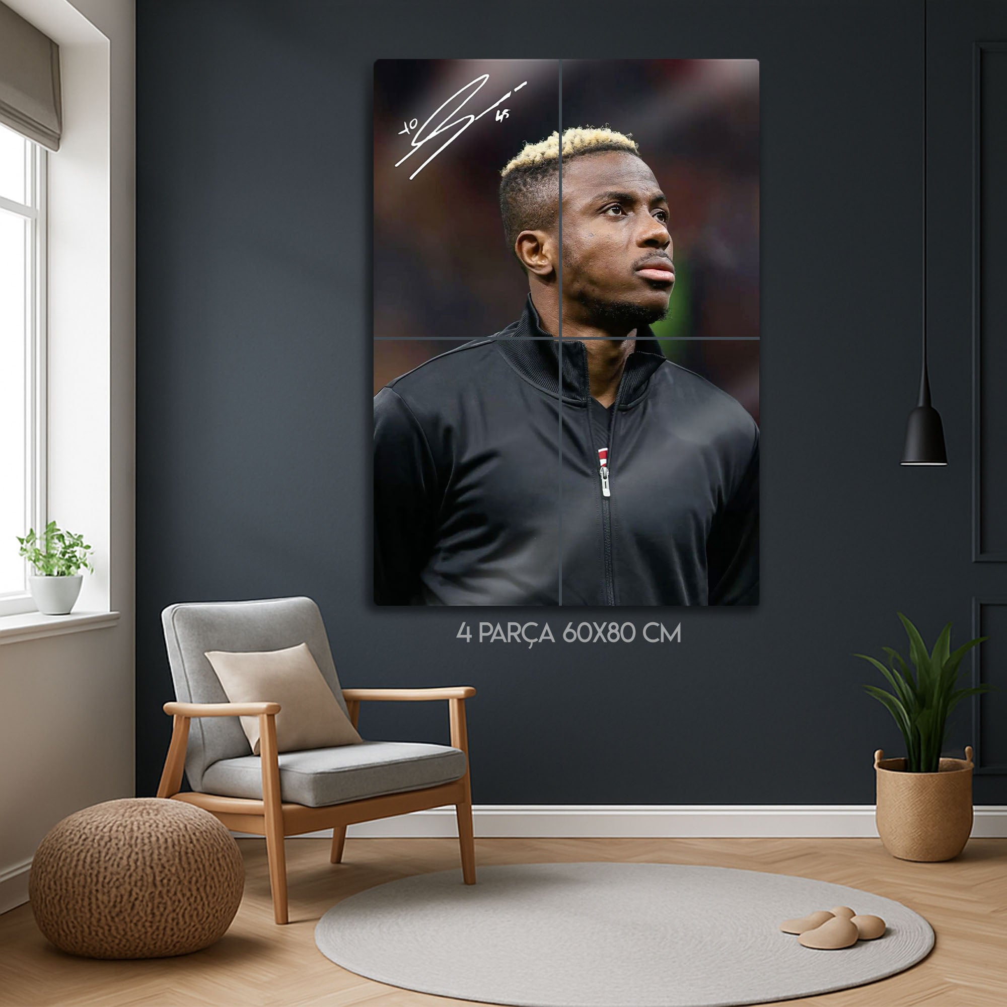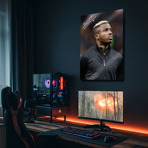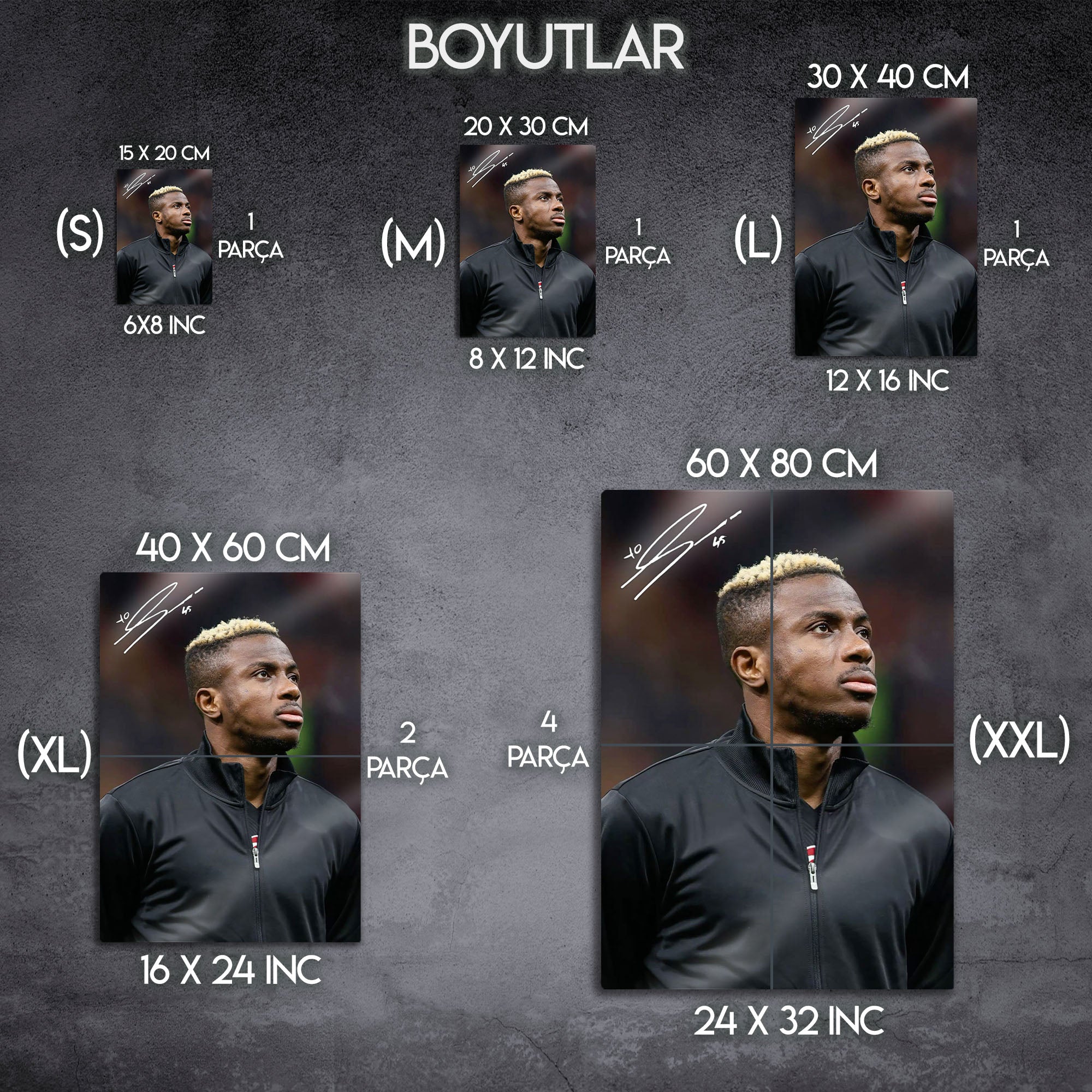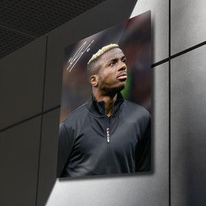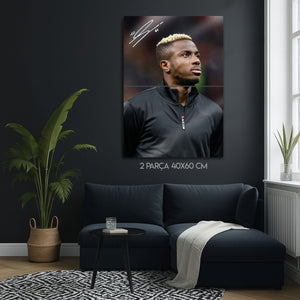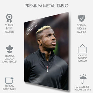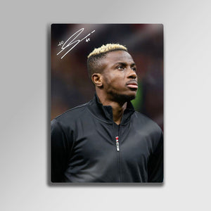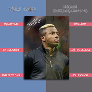Galatasaray'ın yıldızı, Serie A'nın gol kralı, Napoli'nin süperstarı Victor Osimhen'in sahadaki o durdurulamaz ve savaşçı ruhunu duvarlarınıza taşıyın! Bu özel tasarım metal tablo, Osimhen'in imzası haline gelen koruyucu maskesiyle o ikonik ve karizmatik duruşunu, kendi imzasıyla birlikte ölümsüzleştiriyor.