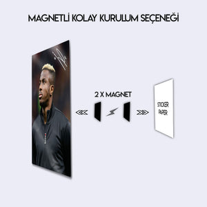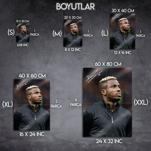Bu eser, her futbolseverin, özellikle de Napoli ve Nijerya Milli Takımı taraftarlarının gururla sergileyeceği, hem güçlü hem de son derece modern bir parçadır. Yüksek kaliteli metal malzeme üzerine basılan bu fotoğraf, o anın her bir detayını, Osimhen'in odaklanmış bakışını ve formasının renklerini canlı bir şekilde yansıtır. Spor odanıza, ofisinize, "man cave"inize veya genç odasına anında bir şampiyonluk ruhu ve futbol coşkusu katacaktır.